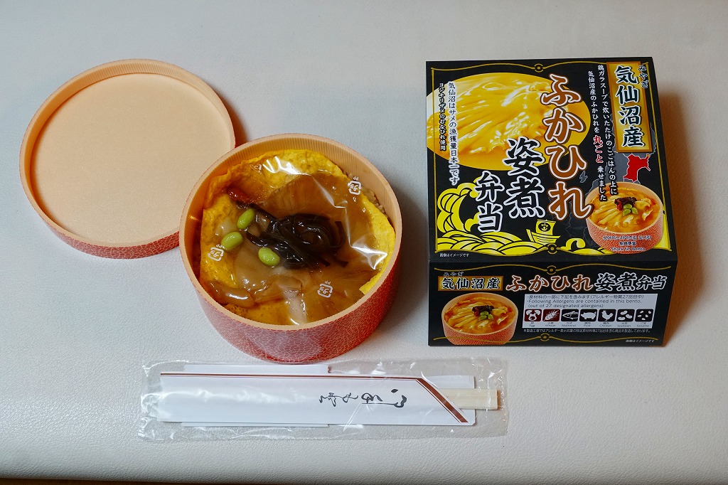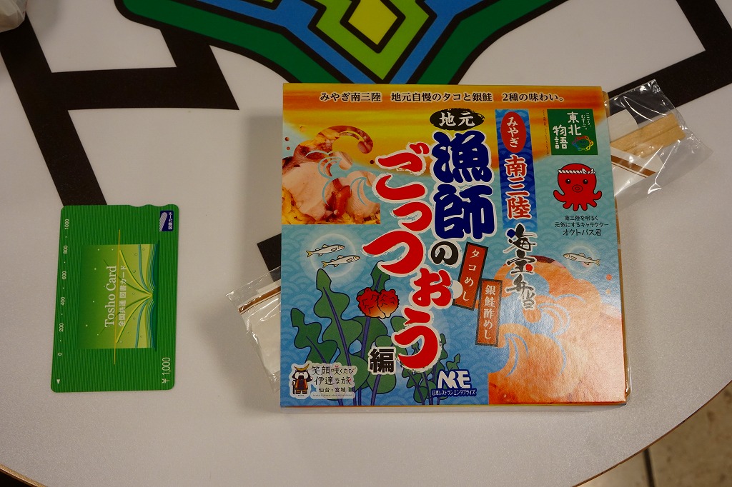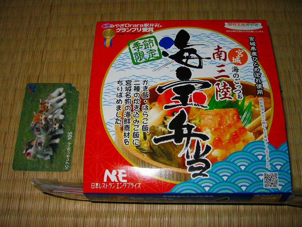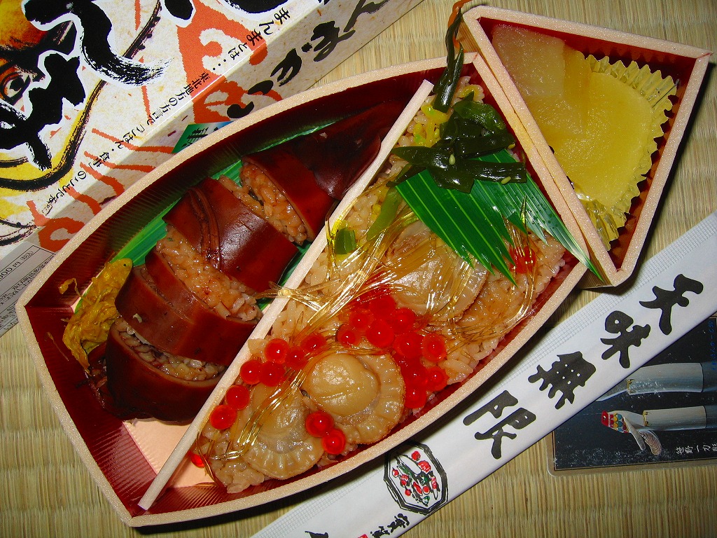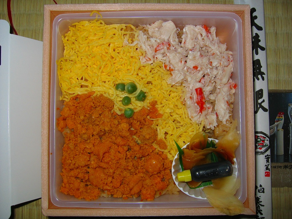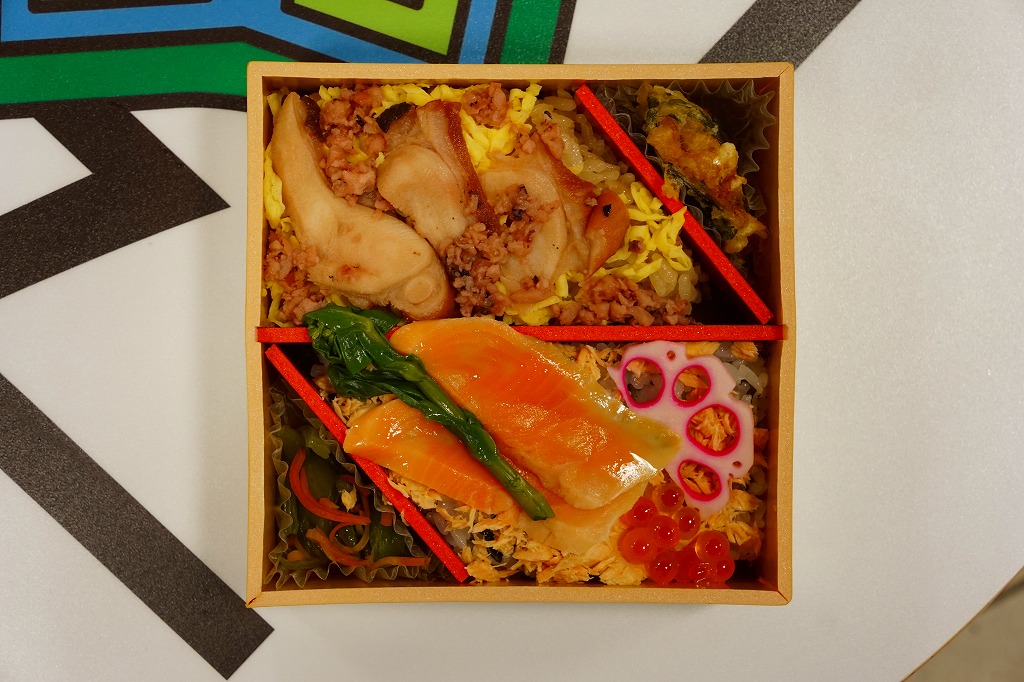 小柄で四角い容器に醤油飯を詰めて錦糸卵で覆い、金華さば酢じめ、あなごの蒲焼、炙り牡蠣、金華かれい酢じめ、花こえび佃煮などを並べる。派手なスリーブや東京での販売という印象に違い、中身は酢飯でなく海鮮でもなく、宮城の食材を満載し、食べて味わって満足できる機能的な内容と分量。地味と滋味が備わると思う。調製元のJR東日本クロスステーションは、かつての日本レストランエンタプライズ(NRE)や日本食堂の仙台支店。仙台駅では売られたかどうか。