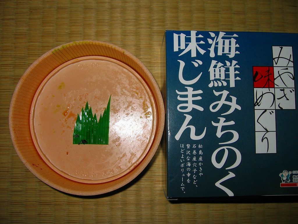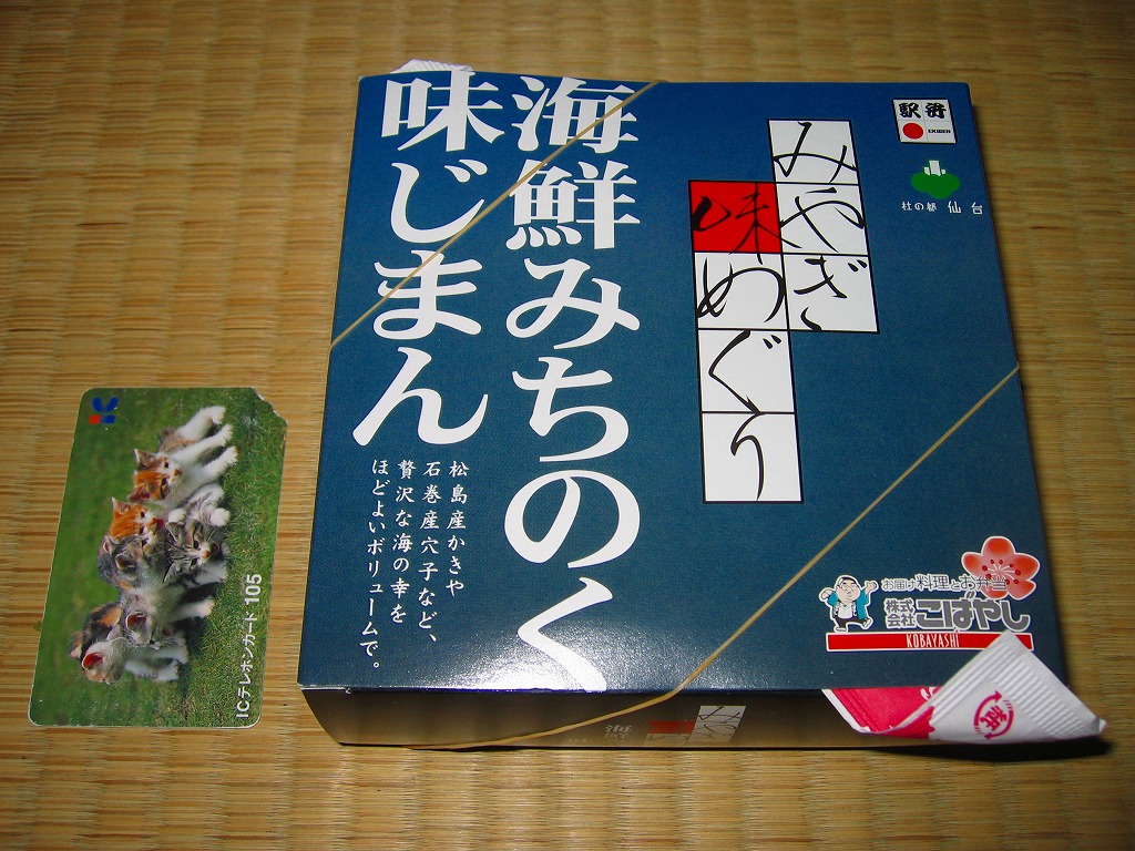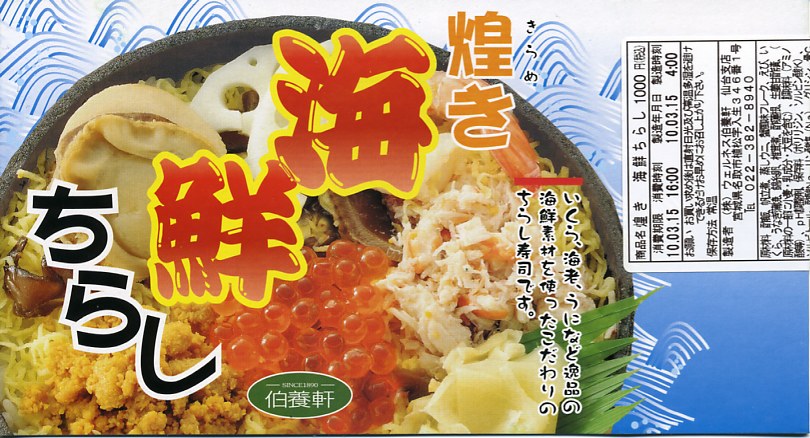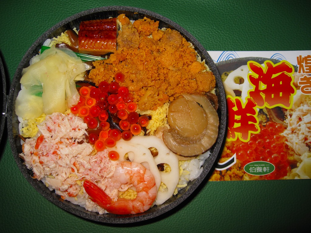 見栄えや内容に対して大仰な名前を名乗る印象で、「海鮮」では御飯の1/3も覆えない少量駅弁。この少量こそがこの駅弁の特徴であり、味は確かな仙台駅弁で、値段もお手頃なので、そういうニーズで駅弁売店にて選択されている。2011年頃までの販売か。