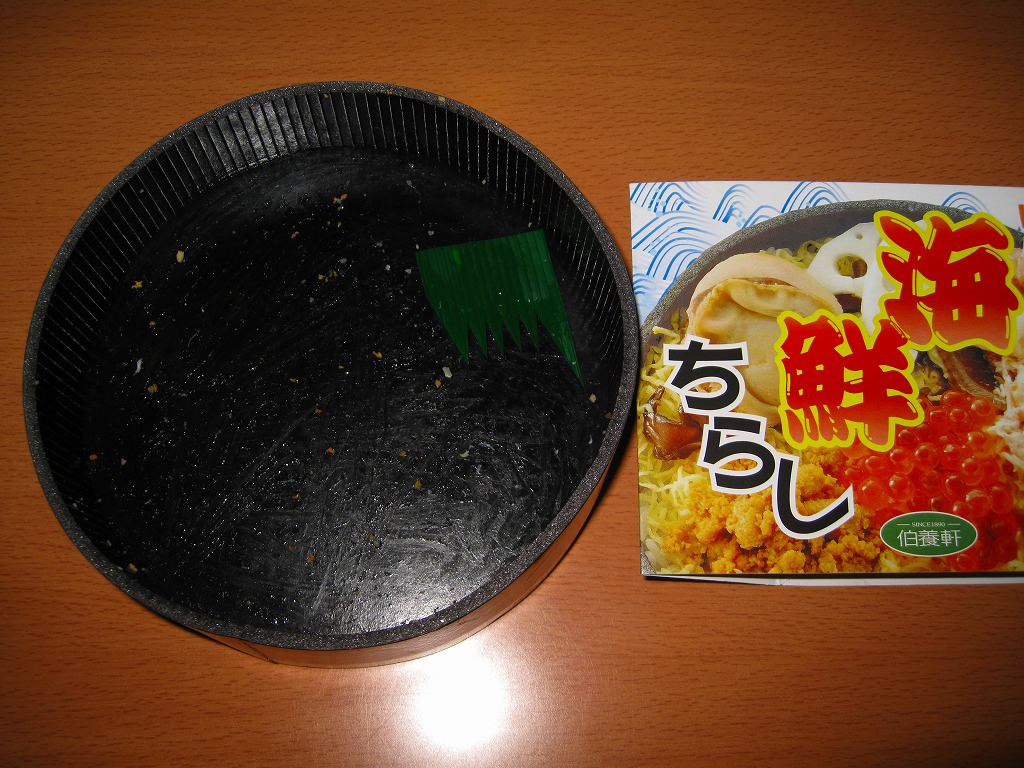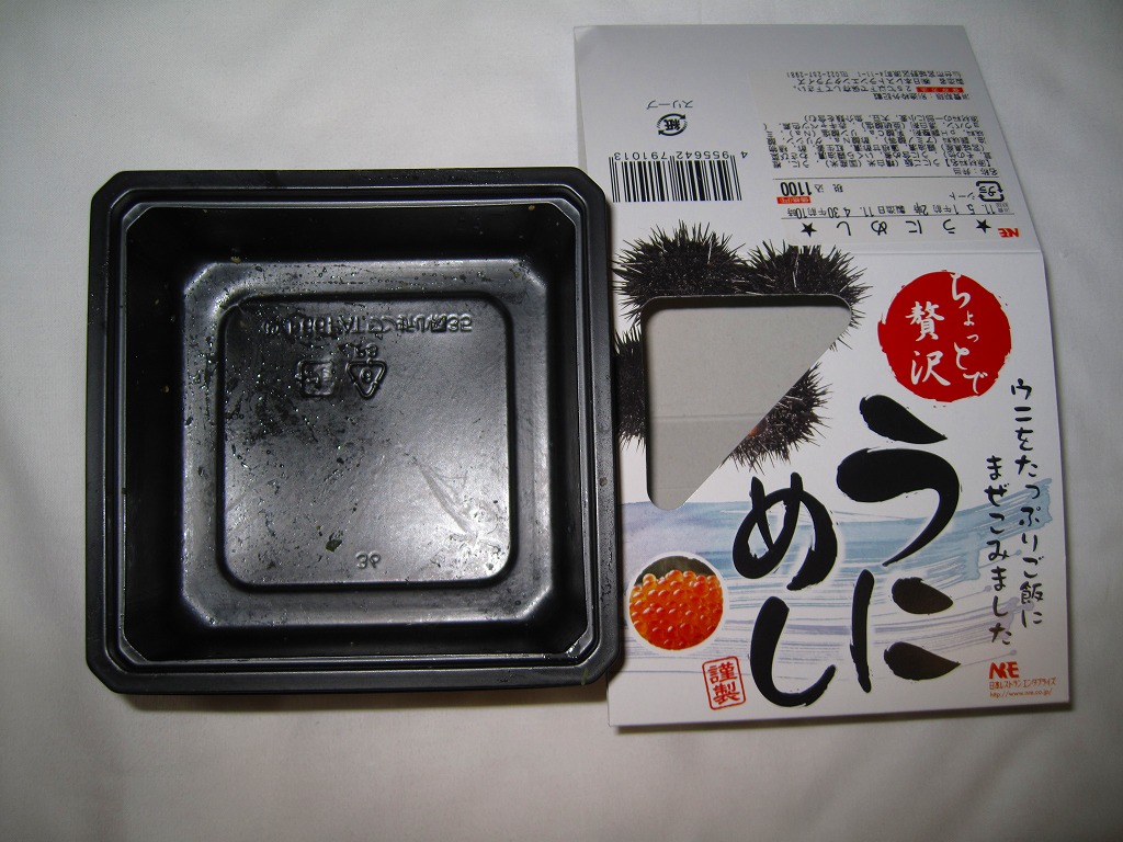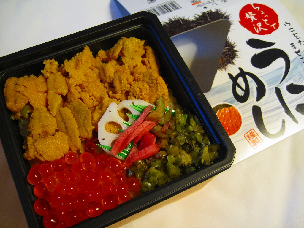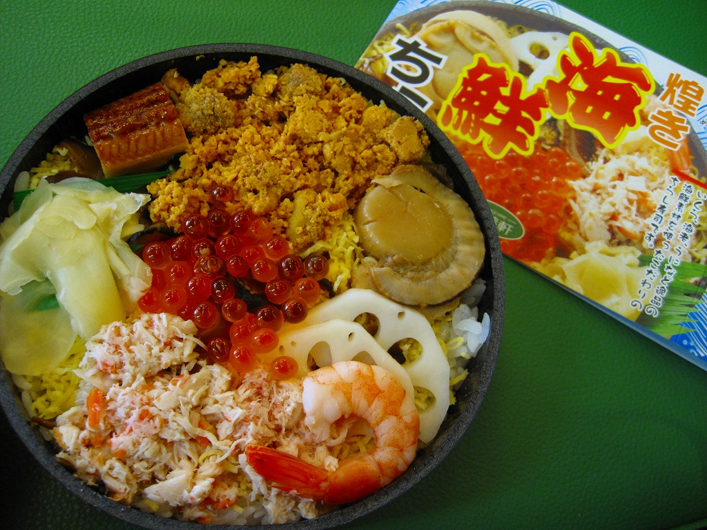 2009(平成21)年に発売か。真っ黒な円形の容器をセロハンテープで固定し、中身の写真を印刷したボール紙の枠にはめる。中身は酢飯の上をホタテ、蒸しウニ、カニ風味フレーク、エビ、イクラ、ウナギ蒲焼、錦糸卵、シイタケ煮、酢れんこん、生姜甘酢で覆う、ウニがメインのちらしずし。具がボロボロこぼれて食べにくいものの、様々な味が口の中に広がる。価格は2010年の購入時で1,000円、2016年時点で1,100円。2018年頃までの販売か。