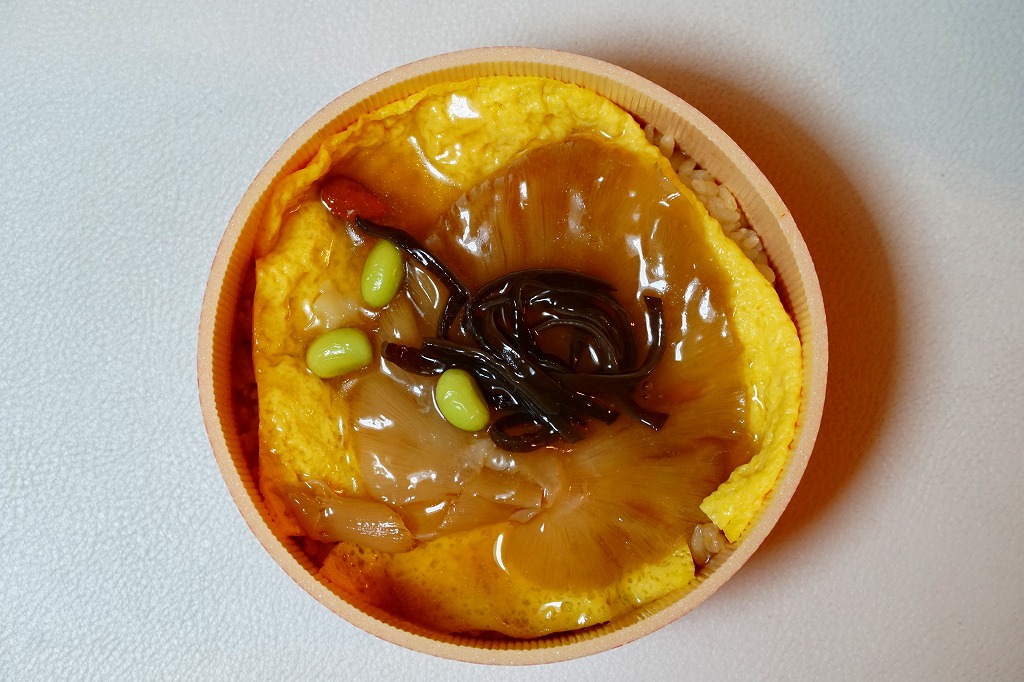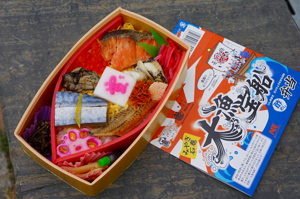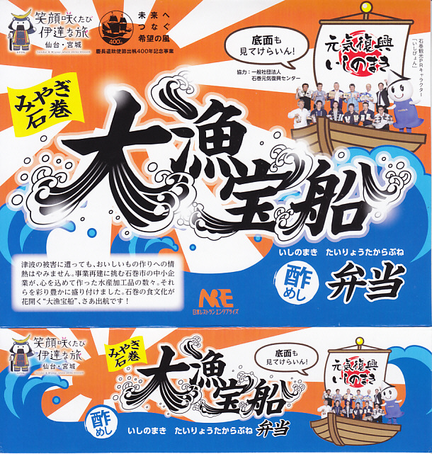 樽型にもイカ型にも見える容器を、賑やかな絵柄と石巻の説明を書いたボール紙の枠にはめる。中身は酢飯を鮭とタラコの漬け焼き、三陸産のつぶ貝煮とイクラ醤油漬と花小えび、宮城県産の小女子とノリの佃煮と炙りかき、石巻産のアナゴ焼きと金華サバ酢締めなどで覆う、ちらしずし。大量ではない分量で、見て食べて感じておいしくなっている。2017年までの販売。