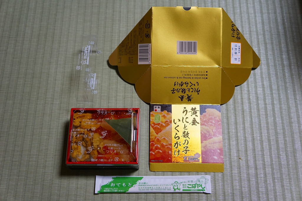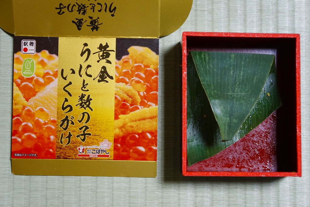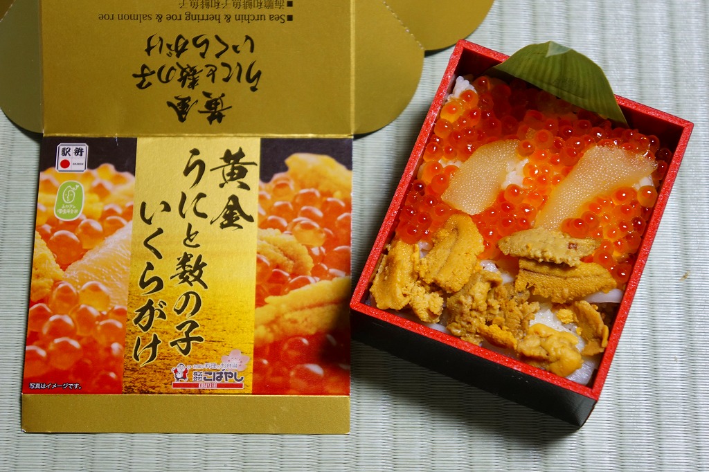 2016(平成28)年12月の発売か。金色と中身の美しい写真がまぶしいボール紙箱に収めた容器に、茶飯を敷き、駅弁の名前のとおりウニとイクラとカズノコで覆う、シンプルな内容。光り輝く内外の見栄えに負けない、良好な味。2020年までの販売か。