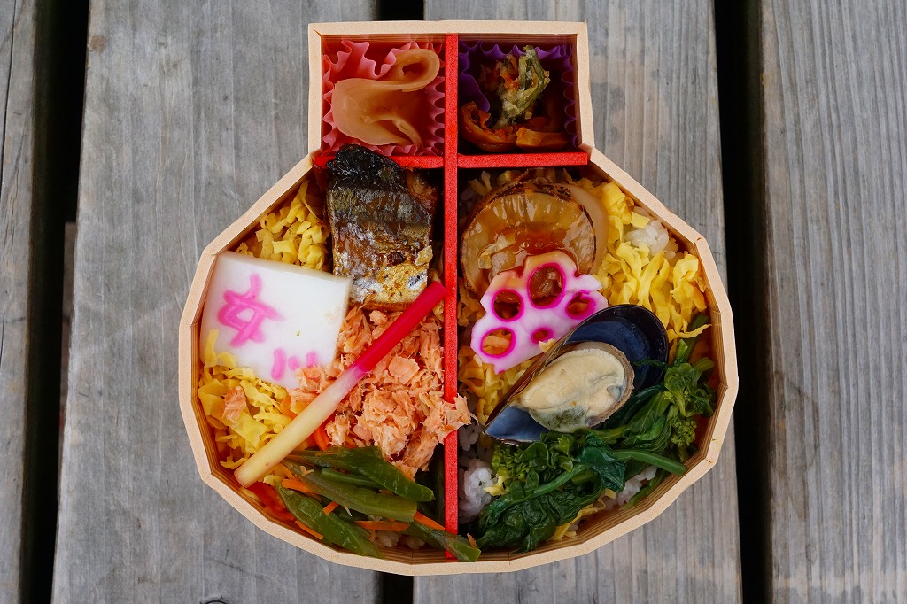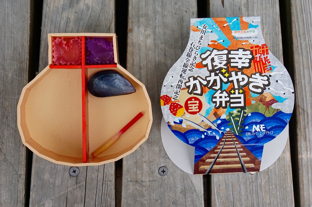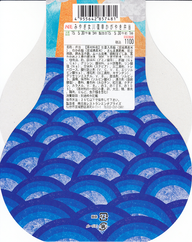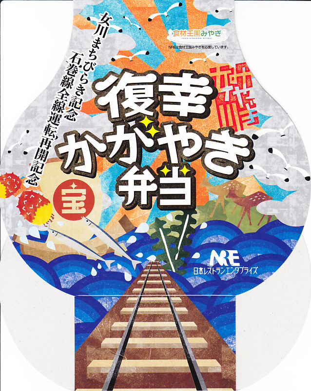 2015(平成27)年3月21日の女川まちびらき及びJR石巻線の全線運転再開を記念して、その同日に発売。震災の影響を受けた4年前の「赤皿貝炊き込み飯」と同じ形のホタテ型容器に、ワカメ御飯と生姜茶飯を詰め、菜の花や鮭フレークや錦糸卵を添え、女川のホヤ、サンマ、ホタテ、ムール貝、かまぼこを使う。添付のおしながきには女川の納入業者5社の名称が並ぶ。小粒な女川の具に滋味があった。約半年間の販売か。