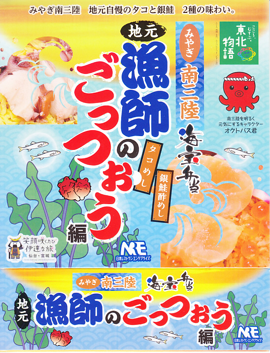 2014(平成26)年8月5日の発売。駅弁屋の日本レストランエンタプライズと、宮城大学食産業学部フードビジネス学科 と、宮城県本吉郡南三陸町の漁業協同組合などが協力して開発したという。駅弁の長い名前を書くパッケージには、地元絡みの様々なロゴマークが付き、底面には南三陸町長の挨拶文が入る。中身はタコめし、銀鮭酢めし、茎わかめの天ぷらと醤油漬。