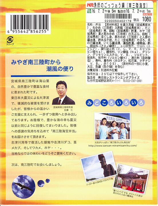 仙台駅の駅弁であるが、テーマは石巻。パッケージの底面で石巻と震災被害と復興への取組を紹介し、おしながきの裏面で駅弁の材料を提供した石巻市内の加工会社6社の名称を紹介する。この駅弁を買った場所も、石巻駅の中のコンビニ。ここまでするのならば、例えばこのコンビニに土休日のみ一日3個でもこれを置いて、石巻駅の駅弁を名乗ってしまえば、より注目と売り上げを得られるのではと思った。