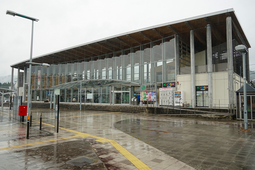 秋田駅から秋田新幹線こまち号で約1時間。1923年の開業時は生保内(おぼない)駅であり、1956年に1町2村の合併で田沢湖町ができ、1966年には駅名も田沢湖駅になり、同年の田沢湖線の全通で田沢湖の玄関口となった。田沢湖駅の駅弁はないが、駅の売店で秋田駅弁の一部や大館駅弁が売られる。1923(大正12)年8月31日開業、秋田県仙北市田沢湖生保内字男坂。