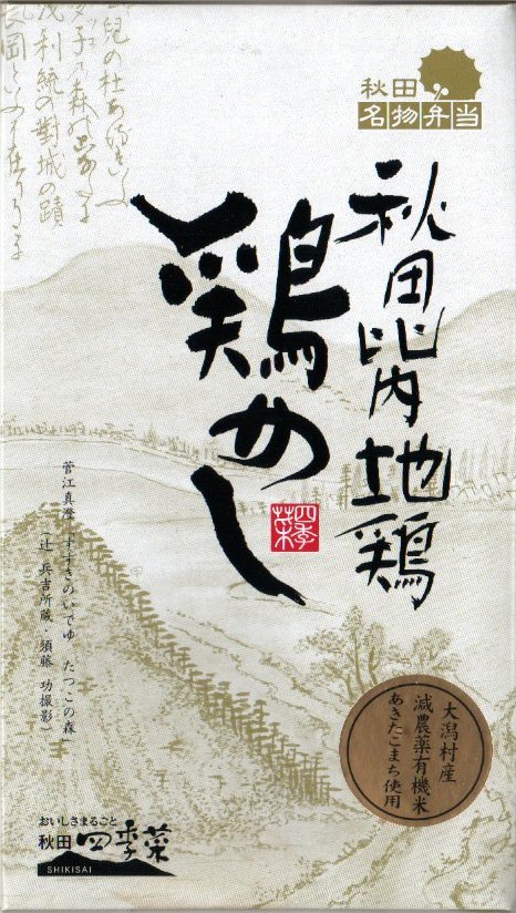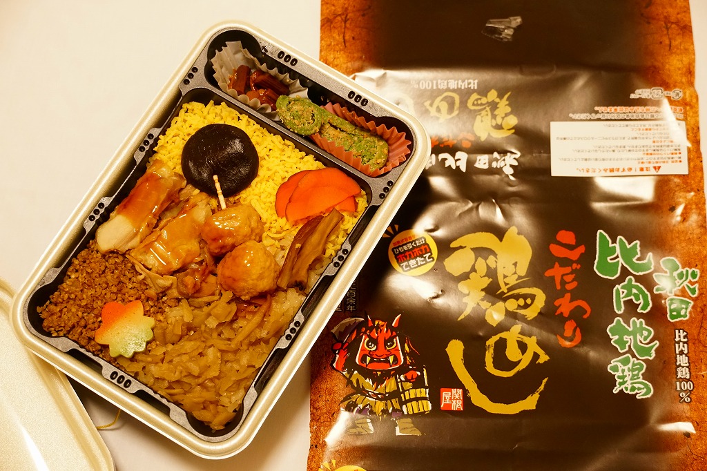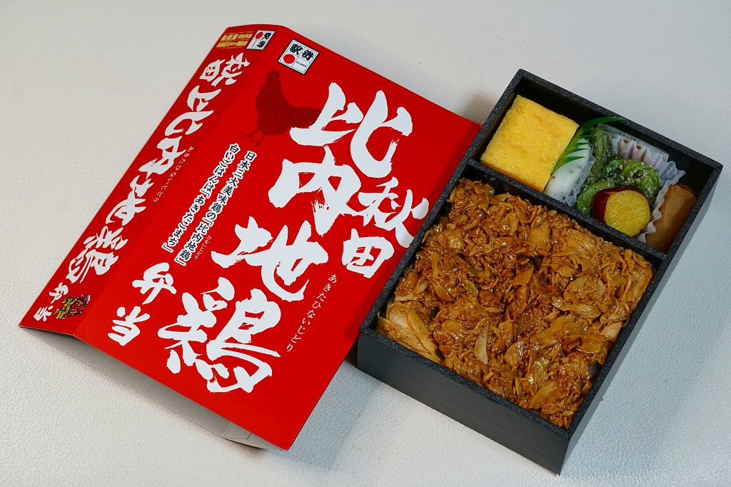 2015(平成27)年8月までに発売か。秋田駅の鶏飯駅弁や比内地鶏の駅弁では最高額のもの。JR東日本の駅弁キャンペーン「駅弁味の陣2015」にエントリー。鶏飯を鶏照焼、鶏ハム、鶏そぼろなどで覆い、鶏ミニメンチカツなどを添える、比内地鶏肉づくし。固めに締まる鶏に加えて、こごみ胡麻和え、いぶりがっこ、じゅんさい、とんぶり入りかまぼこという脇役にこそ味わいがあり、現地で食べれば秋田の旅と味を印象づけることだろう。2017年までの販売か。