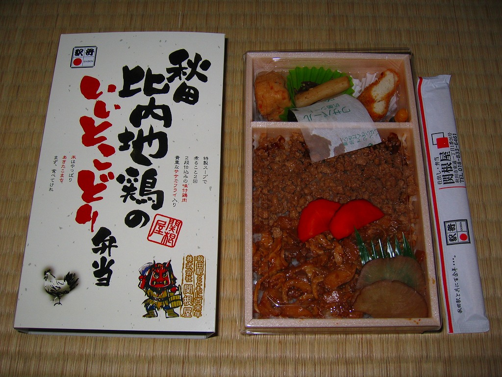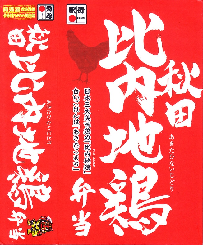 秋冬の駅弁大会シーズンに向けた、2004(平成16)年秋の新商品か。赤いトレーを接着した長方形の容器に透明なふたをして、ゴージャスな雰囲気のデザインなボール紙の枠にはめる。中身は比内地鶏の出汁で炊いたという茶飯の上に、比内地鶏を胡麻混じりのそぼろ・照焼・つくねの三種で載せ、人参と大根のいぶりがっこを加え、じゅんさいやぜんまいを添える、秋田色が豊かな内容。