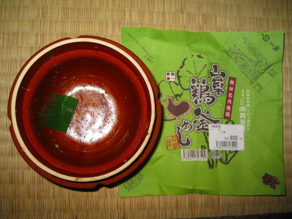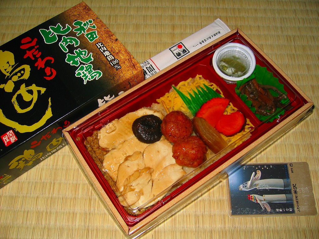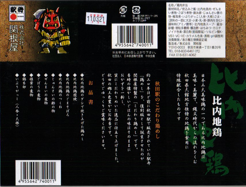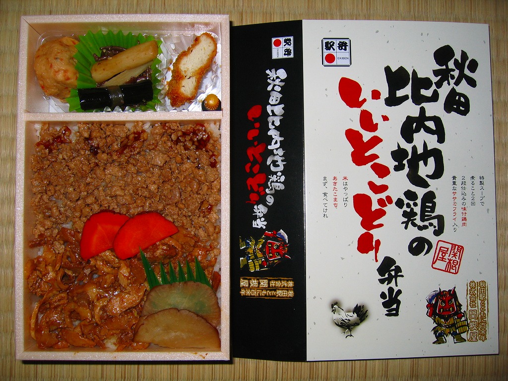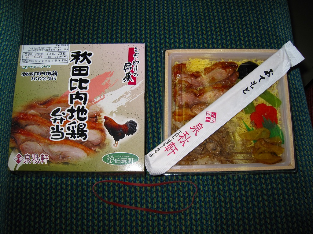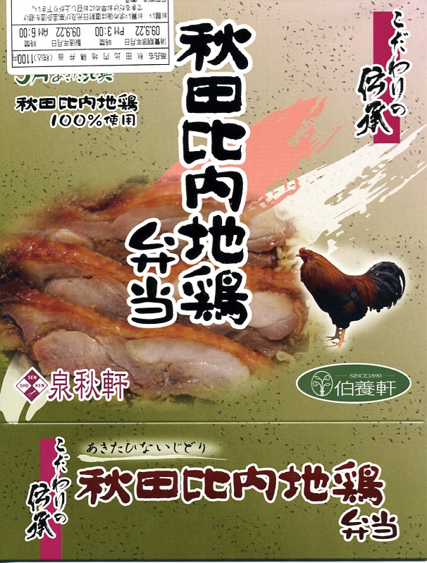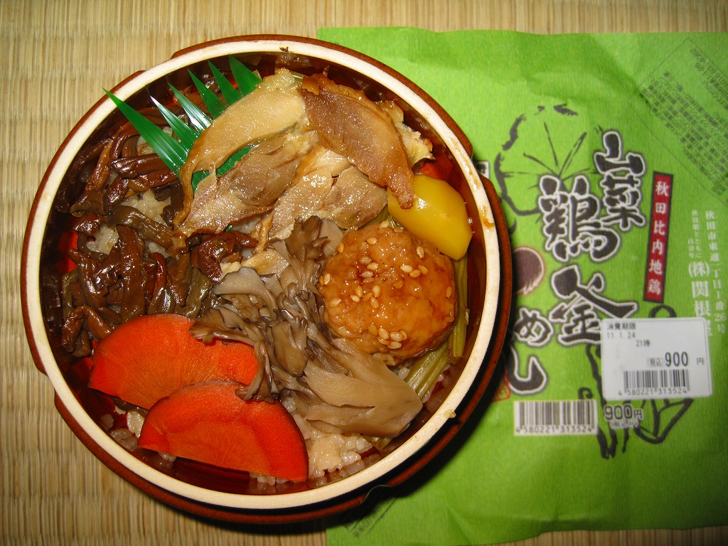 比内鶏は1942年7月に国の天然記念物に指定。だから食用禁止という情報と、もともと食用鶏だから今も食用OKという情報があり、どちらが正しいか分からないが、仮に後者が正解としても数が少ないので駅弁で手軽にとはいかない模様。1970年代に秋田県畜産試験場が、オスの比内鶏とメスのロードアイランレッド種を交配した一代雑種「比内地鶏」を開発、こちらが駅弁や秋田料理レストランなどで提供される。