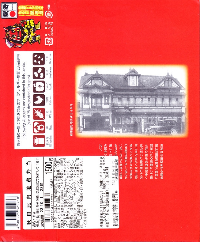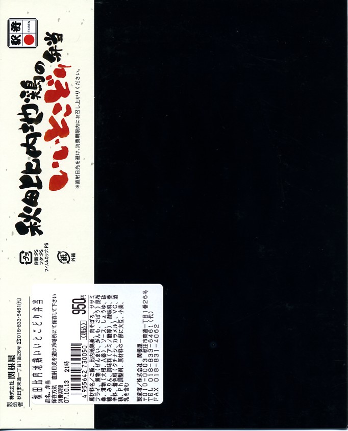 パッケージの上面には泉秋軒と伯養軒の名が並び、側面には「泉秋軒と伯養軒のコラボレーション駅弁」とあり、食品表示ラベルには泉秋軒の文字のみがある。会社精算と事業譲渡で秋田からは消えたはずの伯養軒が、なぜここにいるのかは分からないが、見た感じでは現地では泉秋軒を、駅弁催事への輸送では伯養軒のブランドを使いその仙台支社を名乗っている模様。購入品は「駅弁の達人」マークが食品表示ラベルで隠れ、他に泉秋軒の文字がないパッケージや、伯養軒の文字をシールで隠したものもあるようだ。