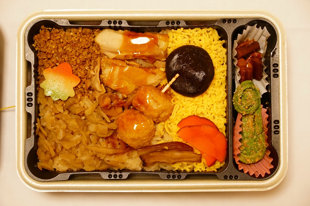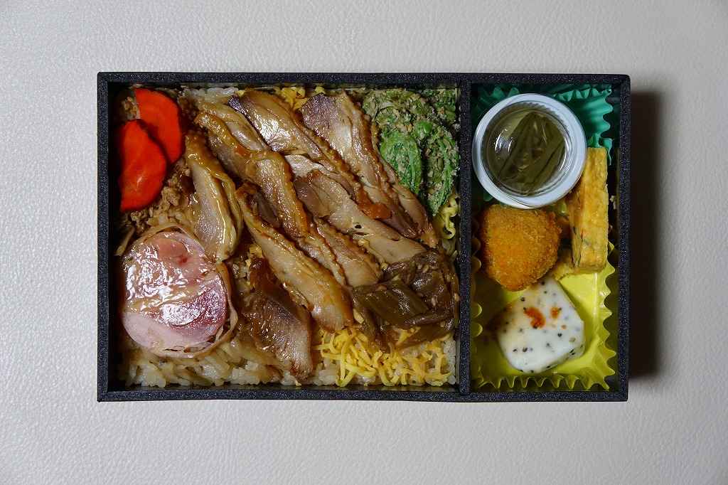 炊き込みご飯を、比内地鶏肉そぼろ、錦糸卵、比内地鶏照焼、比内地鶏つくね、とんぶり入蒲鉾、いぶり人参漬、シイタケで覆い、じゅんさい酢とぜんまい煮を添える。内容に立体感のある鶏飯。価格は発売日の改訂で、これまでの通常版の1,100円から1,150円に上がった模様。