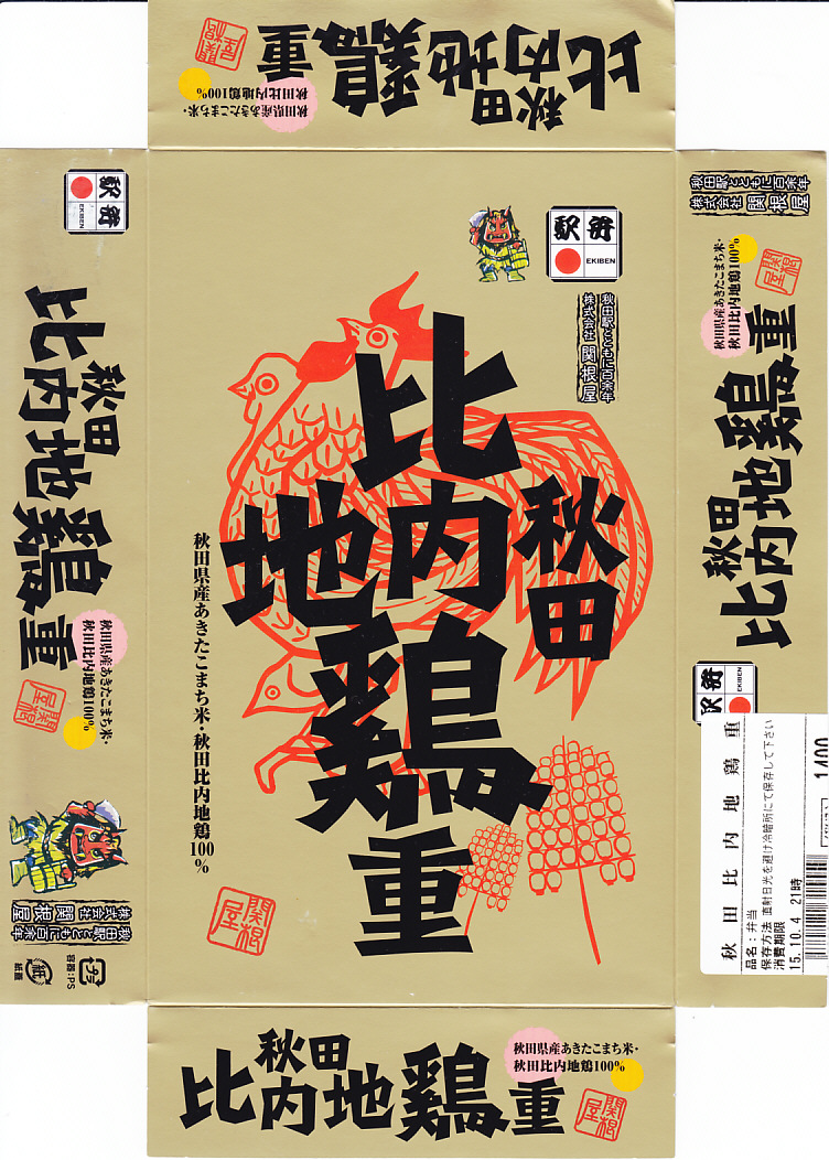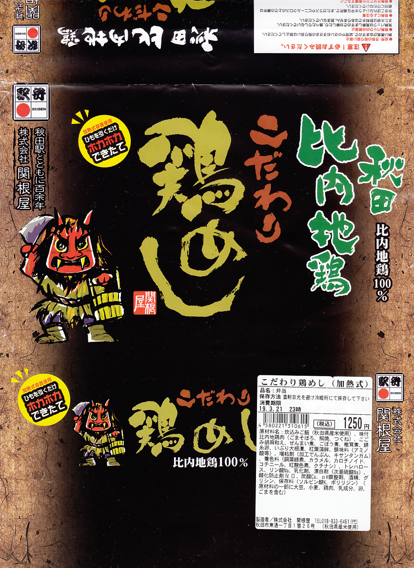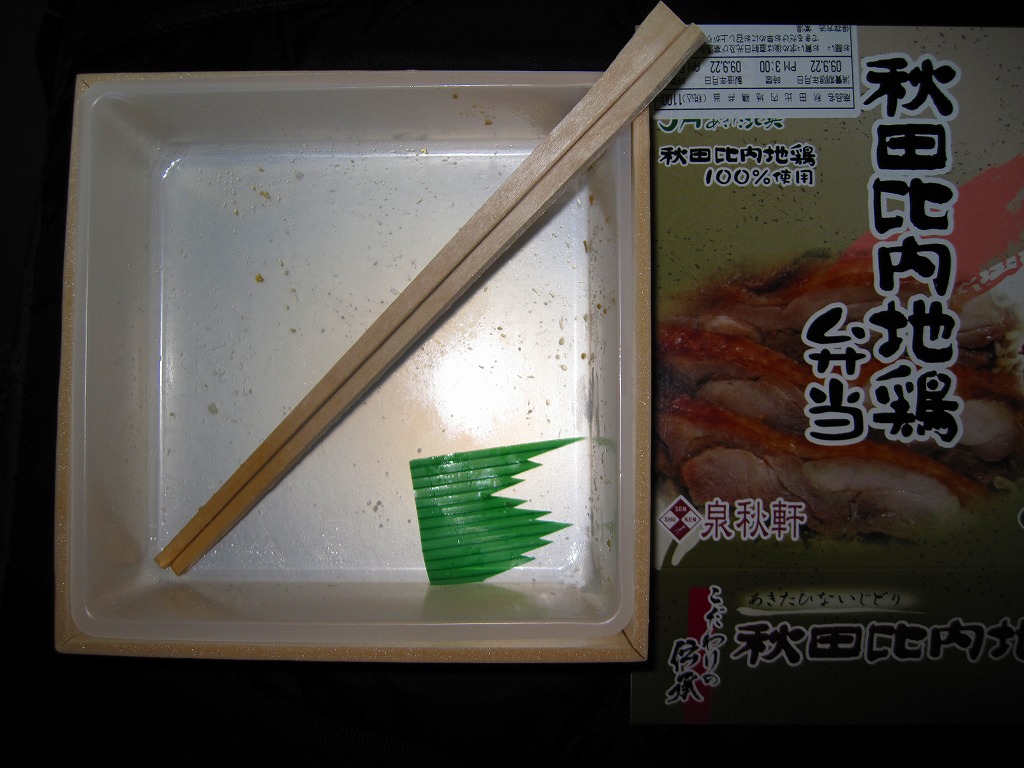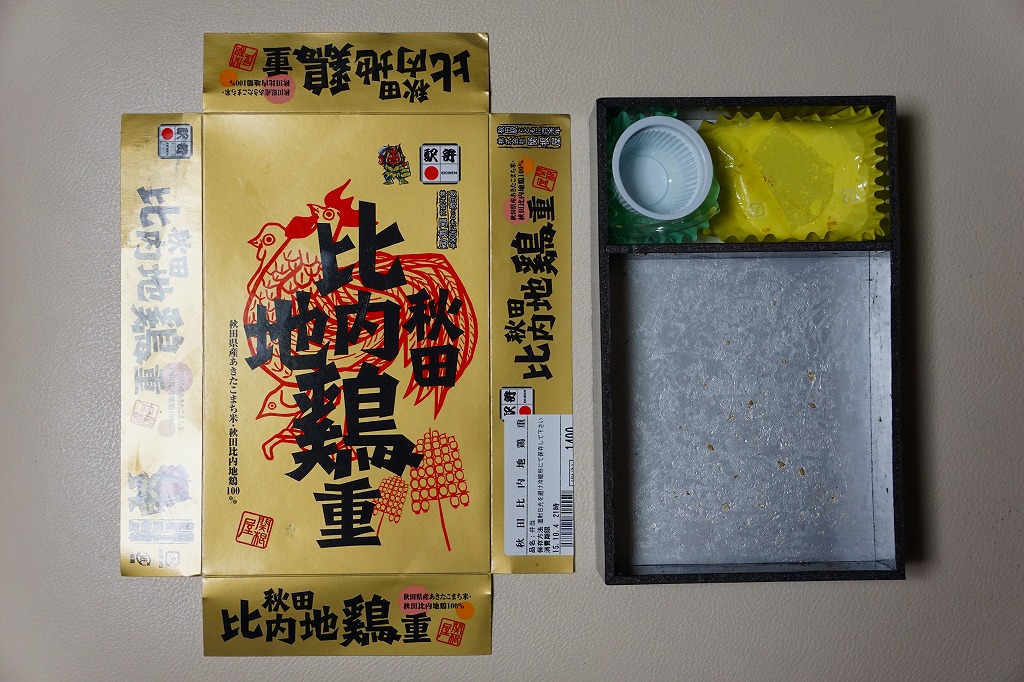 風味も食感も含めて食べてうまい鶏駅弁であり、中身に秋田をびんびんに感じられる駅弁であり、パッケージの絵柄や記載情報が旅を誘う駅弁であり、これはとても良い駅弁ができたものだ。駅弁大会が終わっても現地で長く親しまれるのではないかと思う。価格は2009年の購入時で1,000円、2016年時点で1,050円。2020年あるいは2018年頃までの販売か。