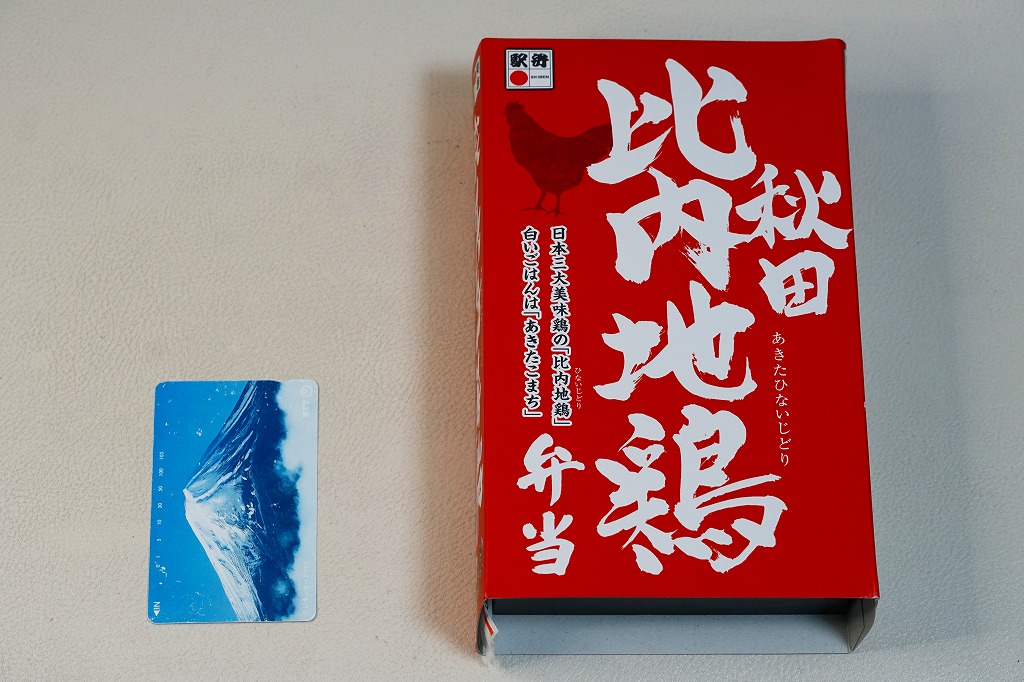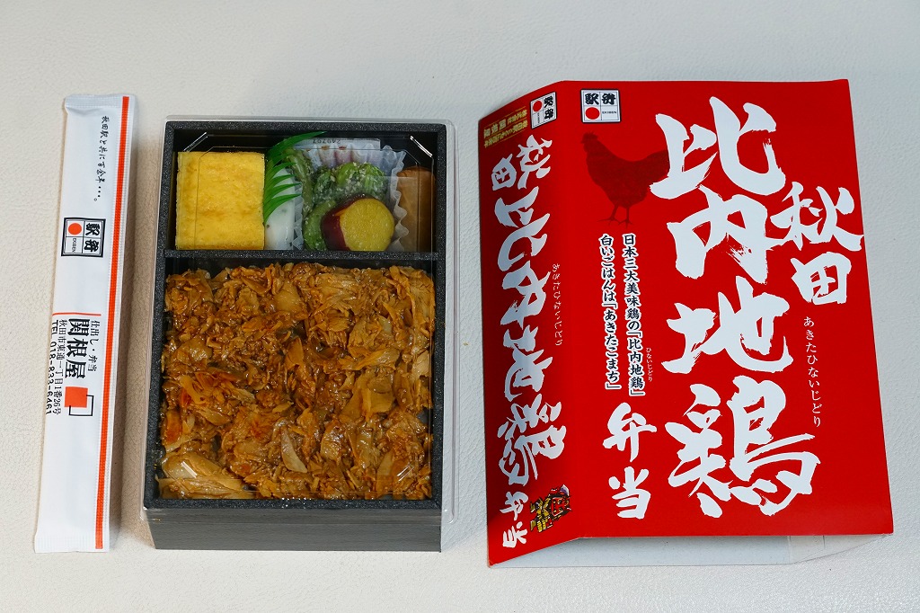 2023(令和5)年10月1日に秋田駅や東京駅などで発売、同日からのJR東日本の駅弁キャンペーン「駅弁味の陣2023」にエントリー。秋田県産米あきたこまちの白飯を、比内地鶏の焼肉で覆い、玉子焼、こごみ胡麻和え、とんぶり入りかまぼこ、さつまいも甘露煮、いぶり大根漬を添える。全国でも鶏肉の駅弁はたくさんあるものの、まるで牛丼のような鶏焼肉丼は珍しいと思うし、下記のとおり秋田駅でいくつも出てきた比内地鶏の駅弁と、使う食材はだいたい同じでも、見た目や風味に変化があり楽しい。赤いスリーブに記す白い商品名も力強い。それにしても鶏飯駅弁で1,500円とは、ずいぶん高くなったものだと思う。