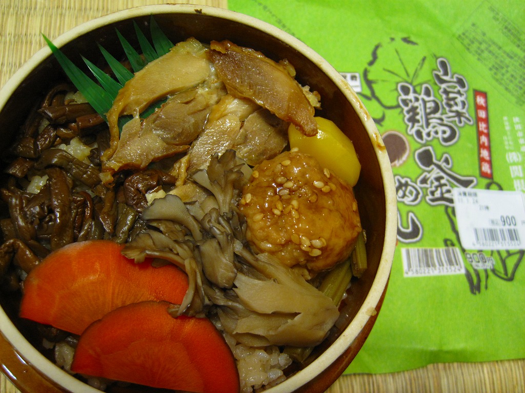 秋冬の駅弁大会シーズンに向けた、2011(平成23)年秋の新商品か。陶製の釜型容器にプラスティック製のふたをして、商品名を書いた黄緑色の掛紙をかける。中身は炊込飯の上を鶏照焼、鶏つくね、ゼンマイ、マイタケで覆い、クリといぶりがっこを添えるもの。もちっとした茶飯がうまく、マイタケやゼンマイにも合う。中央本線小淵沢駅でも過去に同じ名前で似た内容の駅弁が出ている。2013年までの販売か。