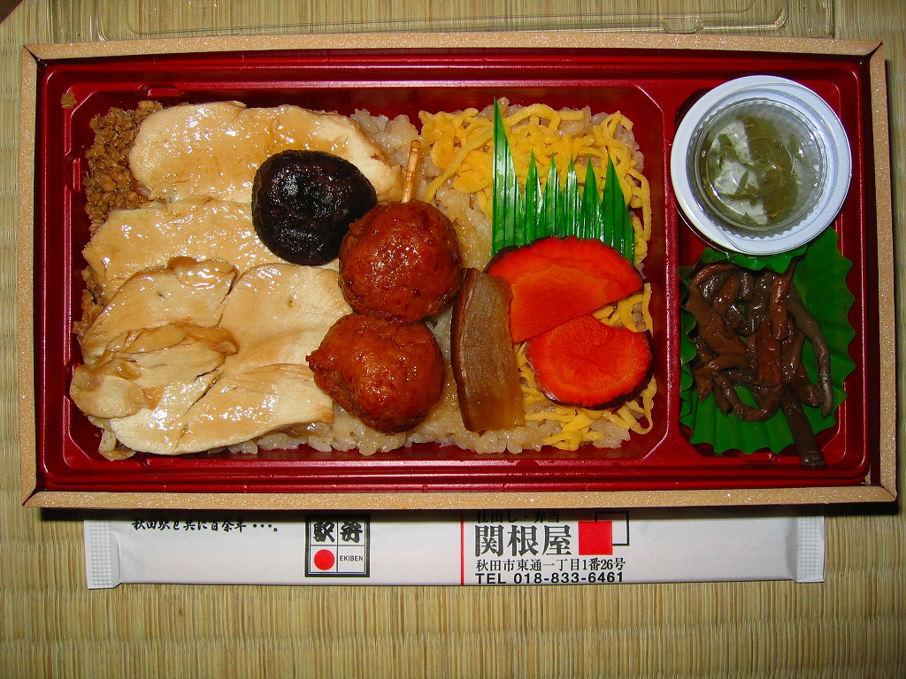 東京駅から新幹線こまち号で約4時間。秋田市は秋田県の中央で日本海に面した、人口約29万人の城下町で県庁所在地。北前船以来の港町でもあり、油田を抱えた工業都市でもあり、以前は商業でも賑わった。駅弁は明治時代の末期までに関根屋が売り始め、以後は大正時代から21世紀までいくつもの業者が進出しては消え、今は関根屋と大館駅の駅弁が駅のコンビニで売られる。1902(明治35)年10月21日開業、秋田県秋田市中通7丁目。