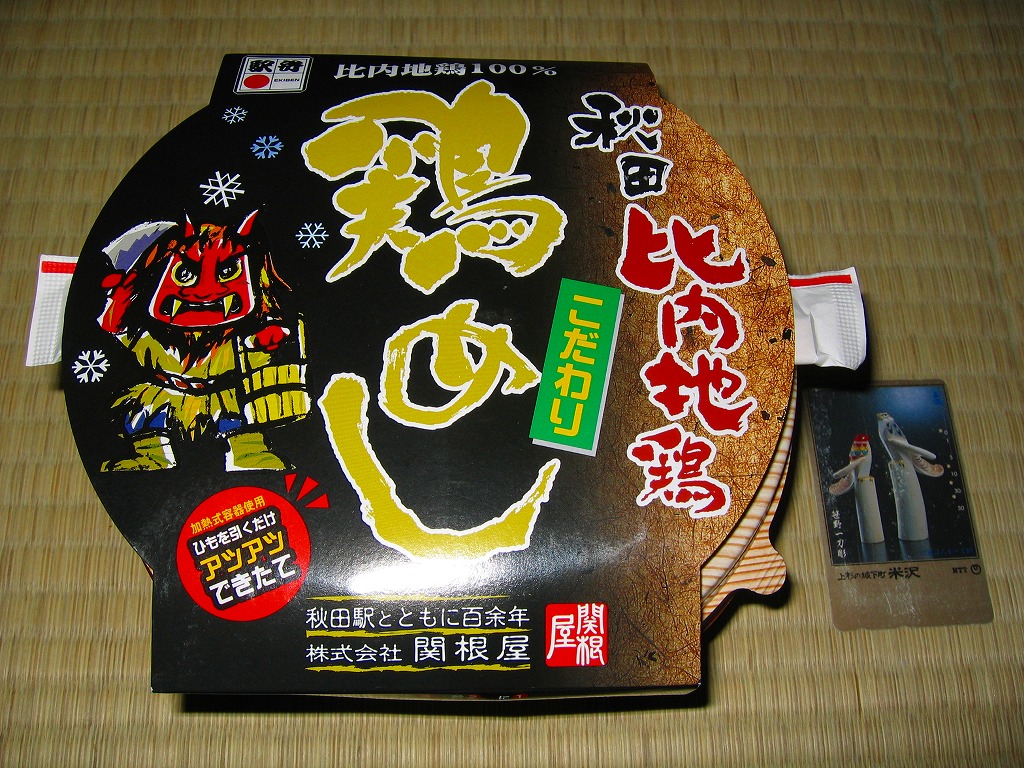 上記の駅弁「秋田比内地鶏こだわり鶏めし」の、加熱機能付き容器版で、同じく2004(平成16)年秋の新製品か。四角い容器に通常版とまったく同じ中身を詰め、秋田駅でおそらく冬季限定の駅弁として販売。価格は2005年当時で1,050円、2016年時点で1,200円、2019年時点で1,250円。もしかすると2019年以降は売られていないかもしれない。