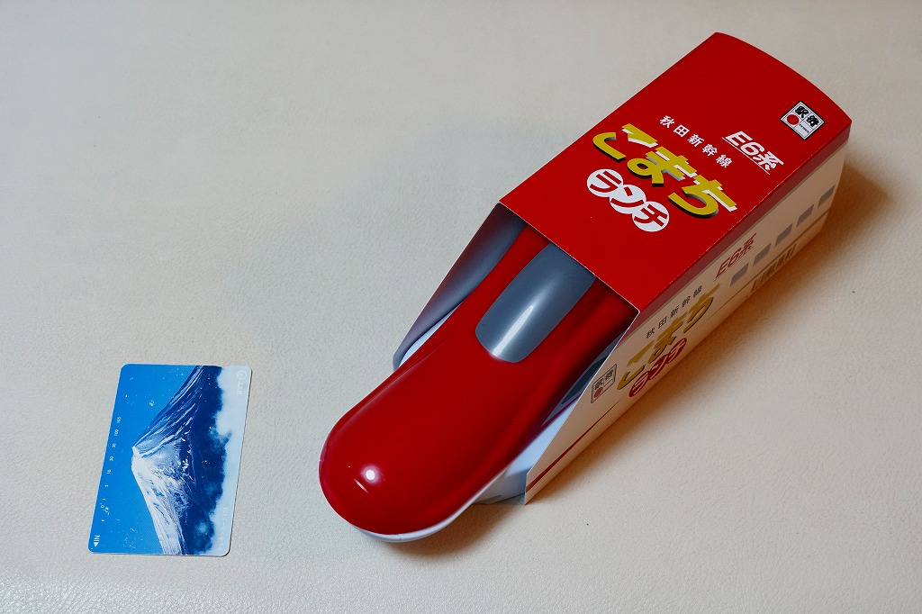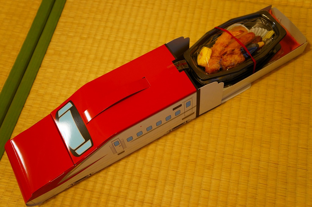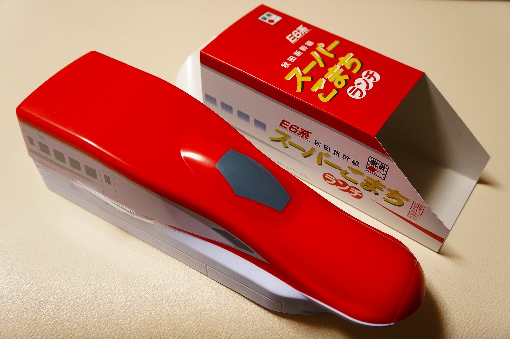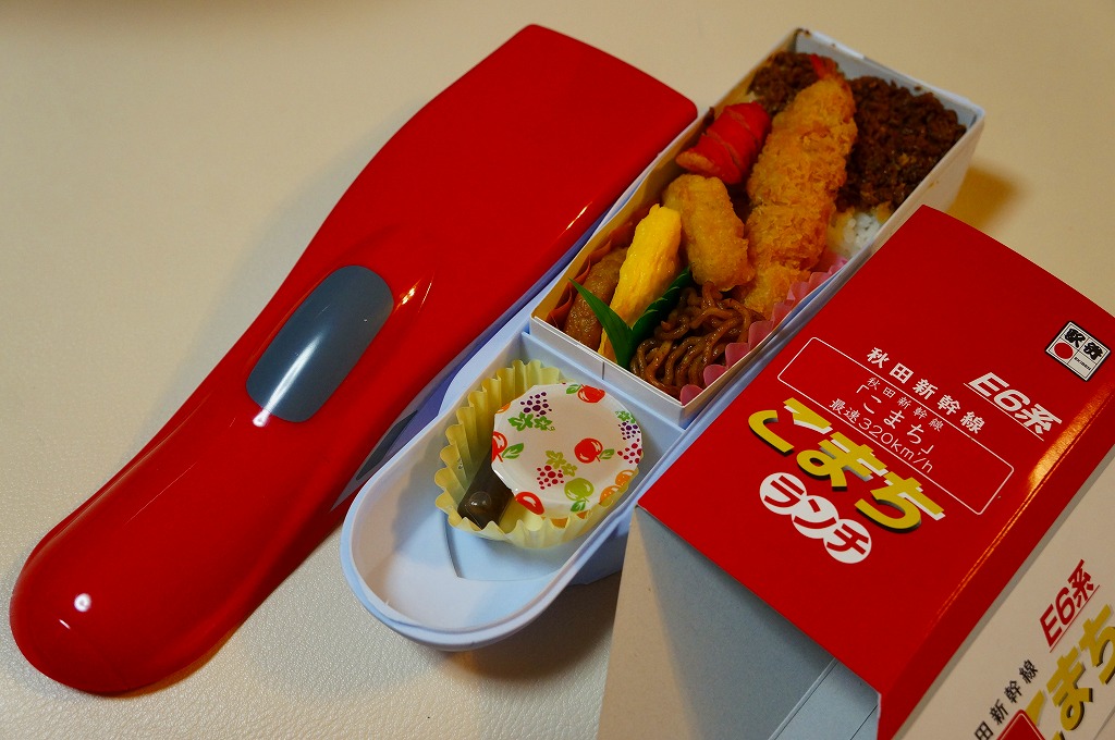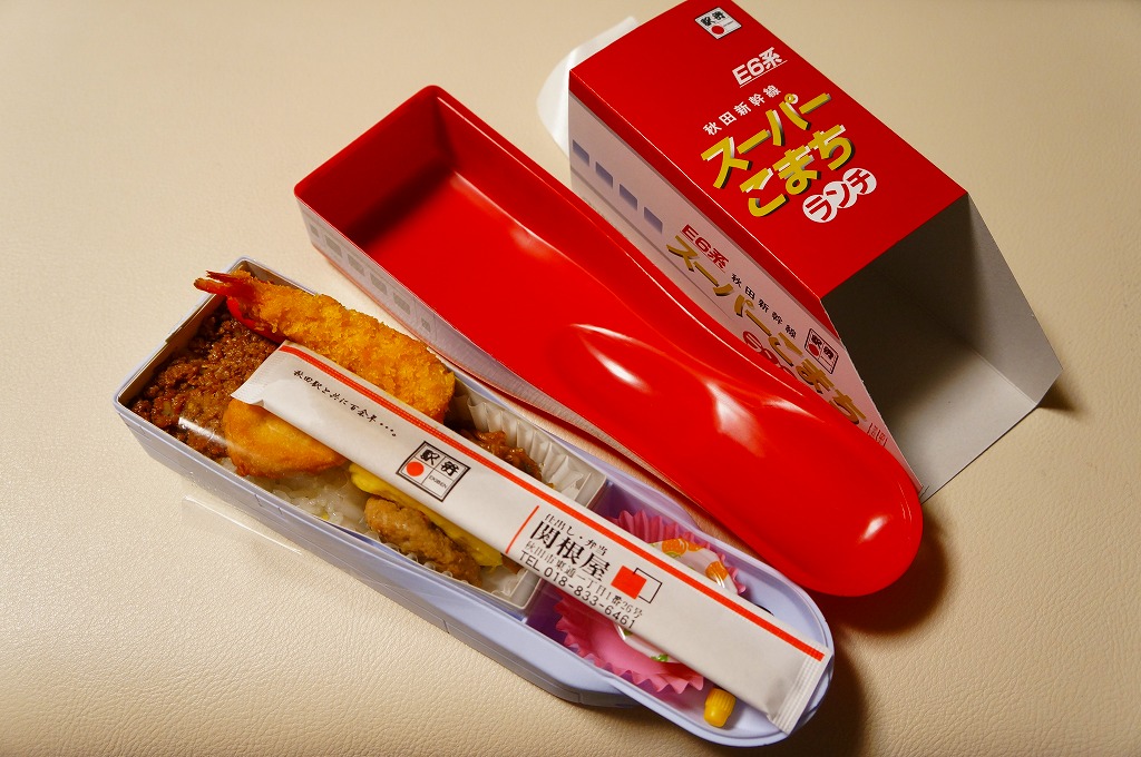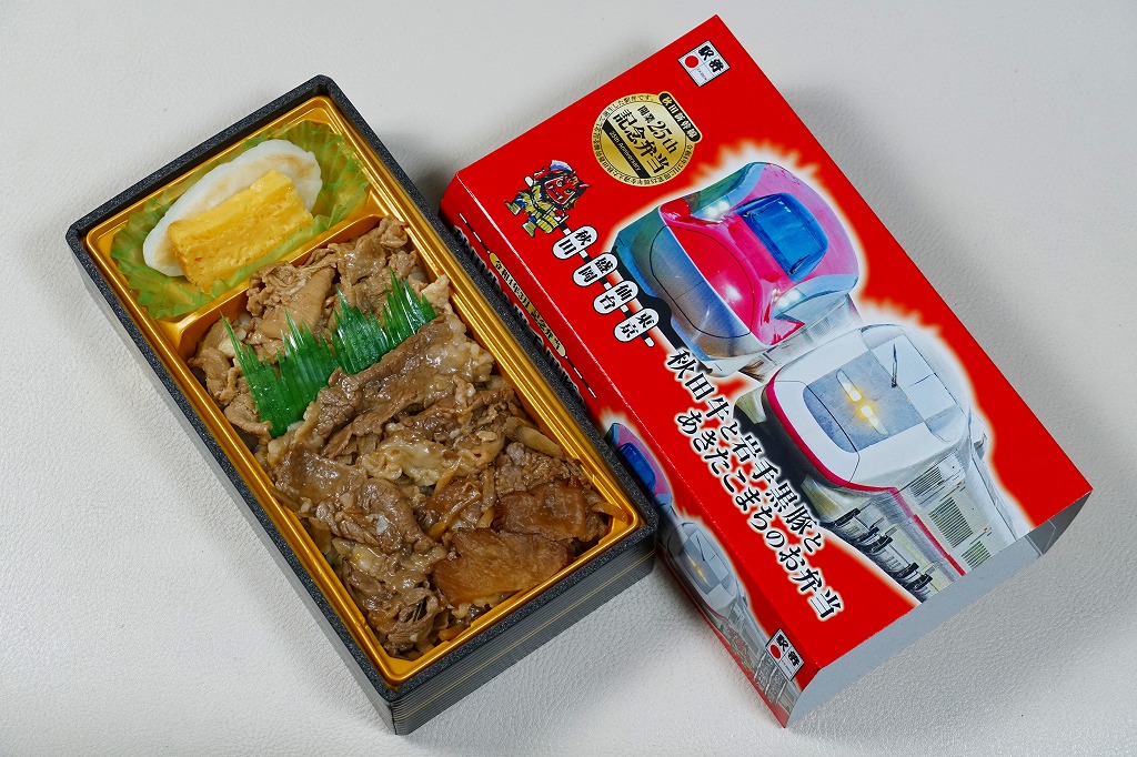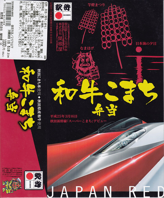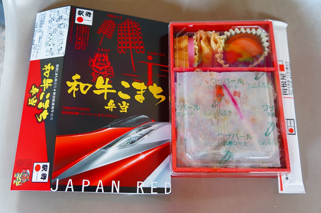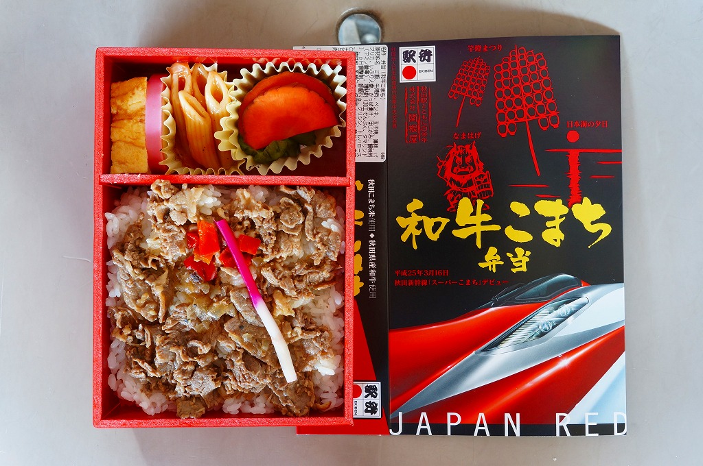 秋田新幹線「スーパーこまち」のデビューに合わせ、2013(平成25)年3月に発売。パッケージには、秋田を表すいくつかのアイコンに加え、E6系新幹線電車CGの先頭部アップが描かれる。赤い容器の中身は、白御飯にオニオンソースの牛焼肉を置き、ペンネ、かまぼこ、玉子焼、いぶりがっこなどを添えるもの。中身の写真のとおり、薄毛の牛肉から白飯の地肌がよく見える、寂しい牛丼。しかし秋田県産和牛の味は、パッケージ記載「秋田こまち米」とともに柔らかく確かだった。価格は2013年の発売時や購入時で1,000円、2014年時点で1,050円、2017年時点で1,100円、2020年時点で1,140円。2021年までに販売を休止し、2022年で終売か。