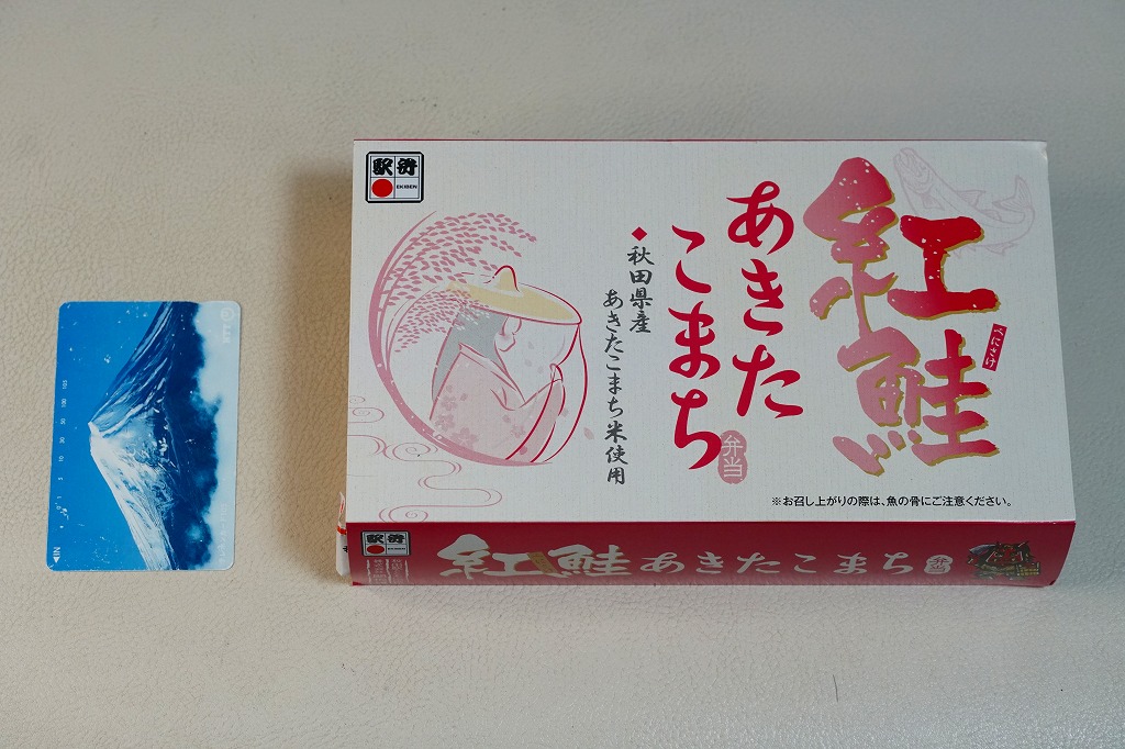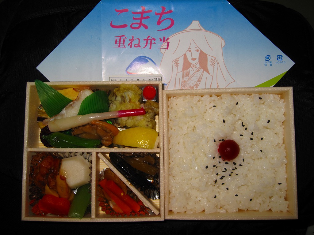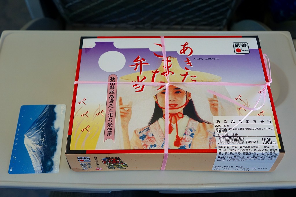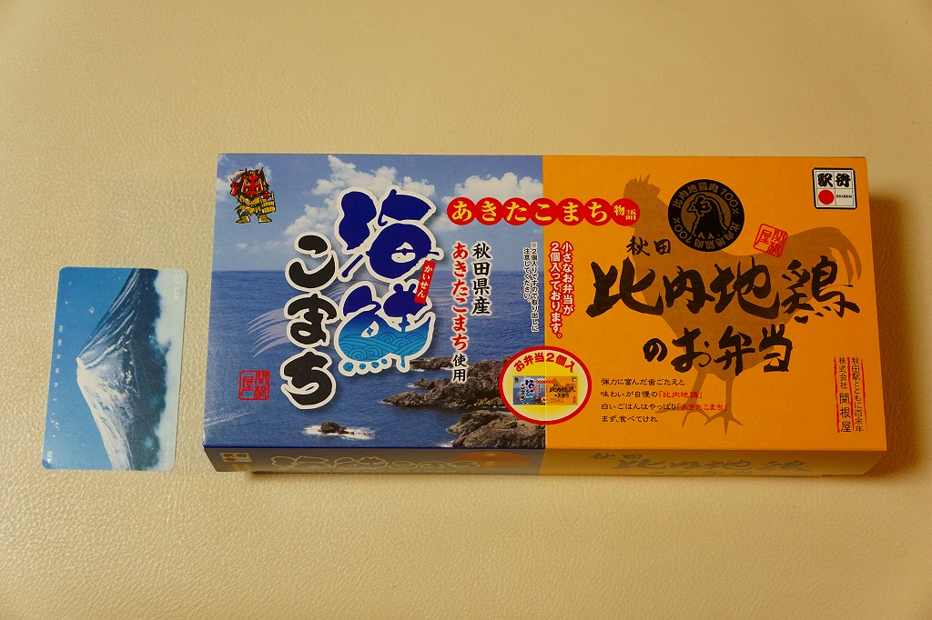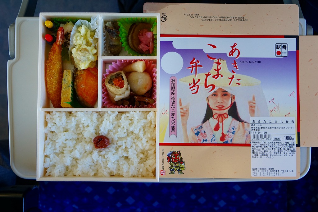 秋田に伯養軒の支店があった頃から存在した駅弁で、外見も内容もそっくりそのまま泉秋軒へ引き継がれた模様。柔らかい正方形の容器を二段重ねて、木目柄のボール紙でふたをして、秋田新幹線と女性を描いた掛紙で包み、ビニールひもで十字にしばる。中身は下段が日の丸御飯、上段がおかずで舞茸天、帆立煮、メダイ焼、玉子焼、サトイモやニンジンなどの煮物、フナ甘露煮など。秋田らしさはぼやっと見ただけでは分からないけれど、おいしい幕の内駅弁。
