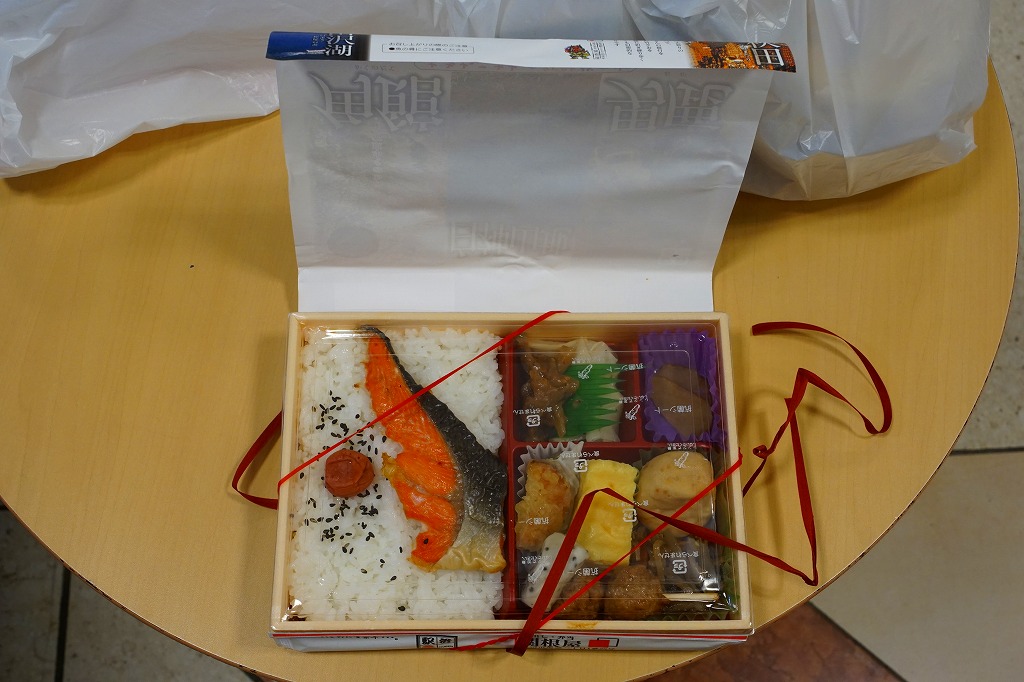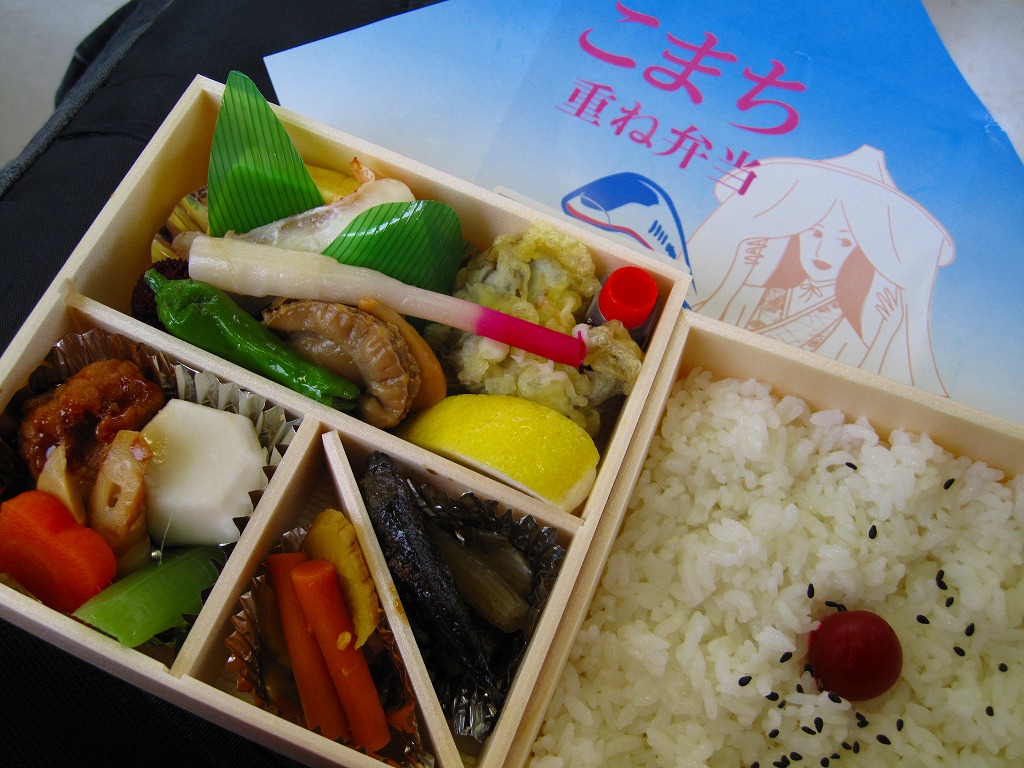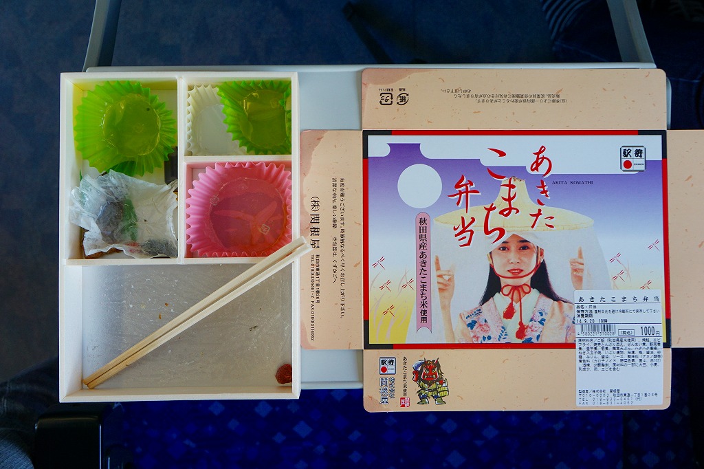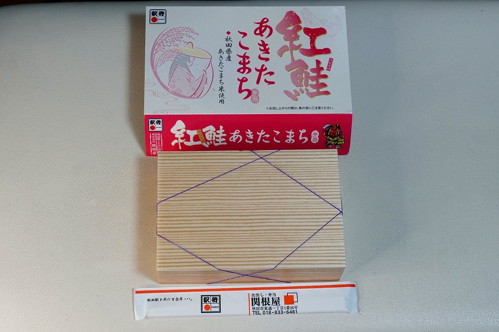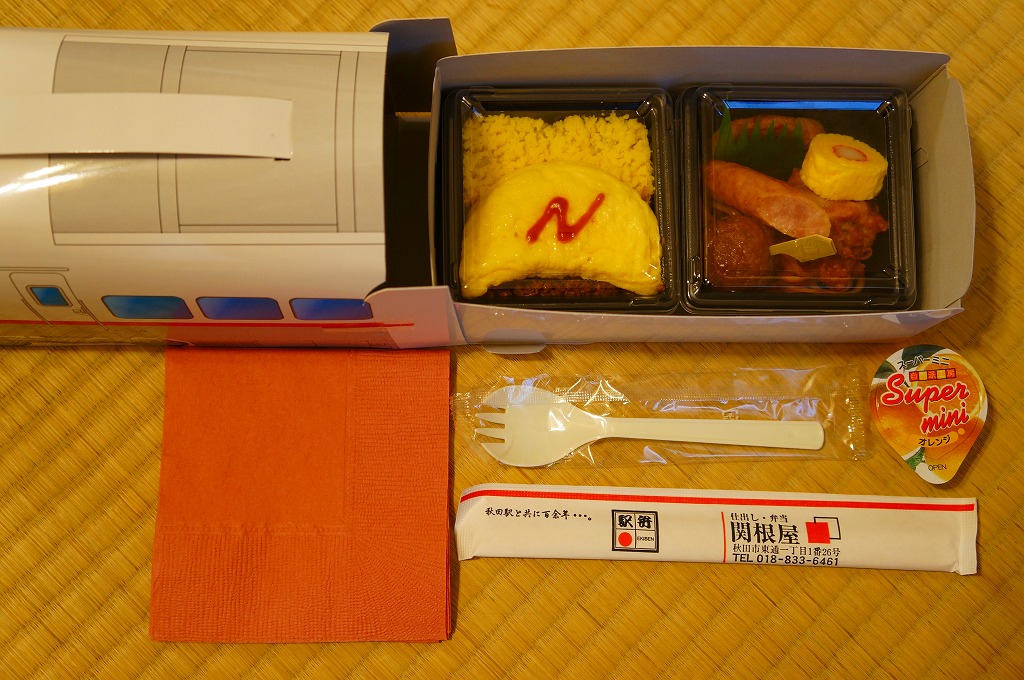 秋田に伯養軒の支店があった頃から存在した駅弁で、外見も内容もそっくりそのまま泉秋軒へ引き継がれた模様。柔らかい正方形の容器を二段重ねて、木目柄のボール紙でふたをして、秋田新幹線と女性を描いた掛紙で包み、ビニールひもで十字にしばる。中身は下段が日の丸御飯、上段がおかずで舞茸天、帆立煮、メダイ焼、玉子焼、サトイモやニンジンなどの煮物、フナ甘露煮など。秋田らしさはぼやっと見ただけでは分からないけれど、おいしい幕の内駅弁。