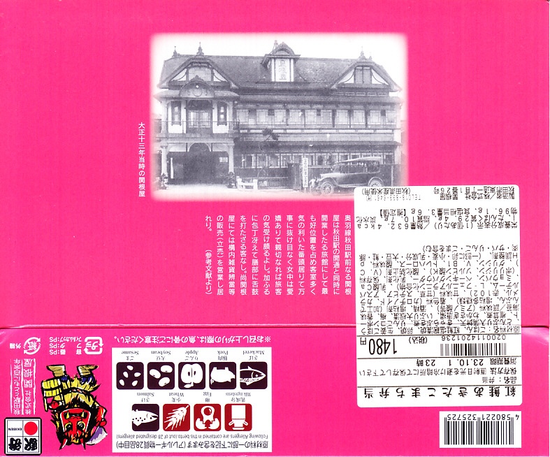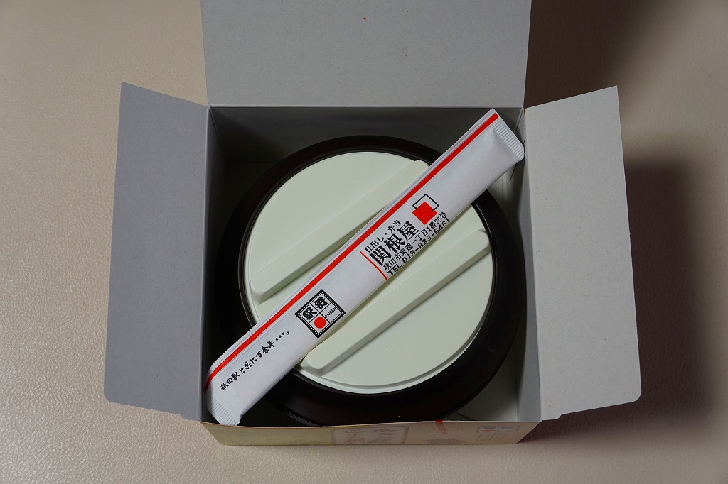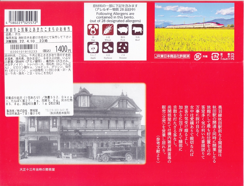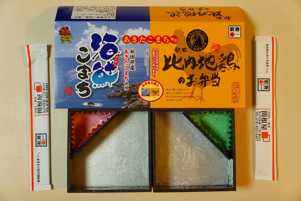 中身の見た目が雑然として、他の秋田駅弁に比べて味が引き立っていないのが惜しいが、秋田が分かりやすい内容である。写真のとおり、新宿駅のNREの駅弁売店は、夕刻になると売れ残りの駅弁を200円引きで販売する。これは駅の駅弁売店では、とても珍しい。2018年までの販売か。