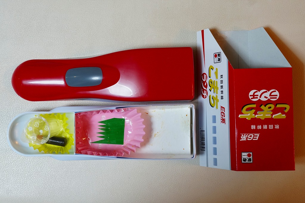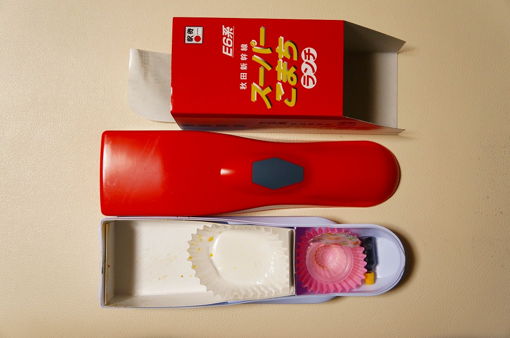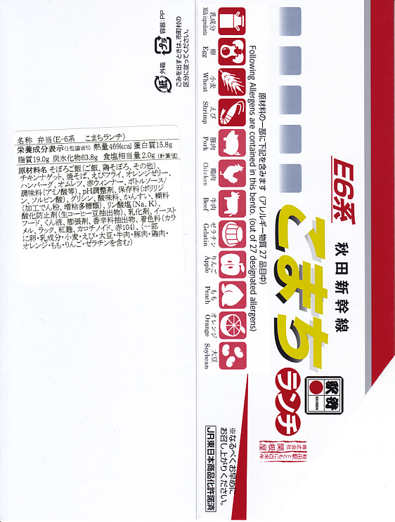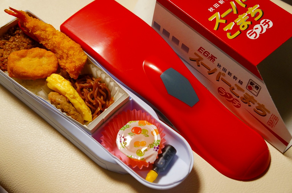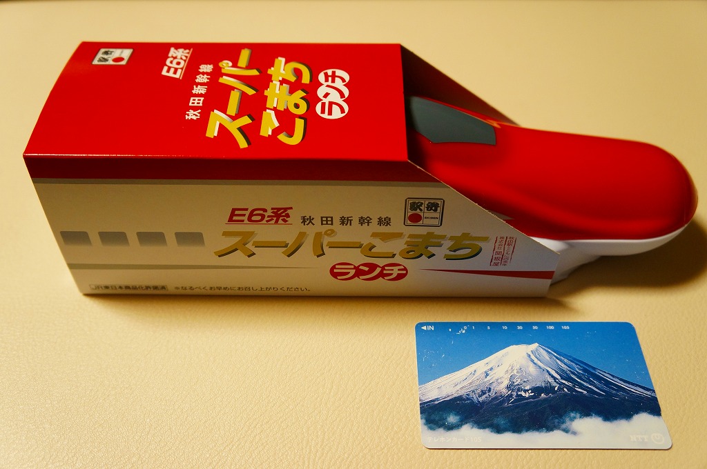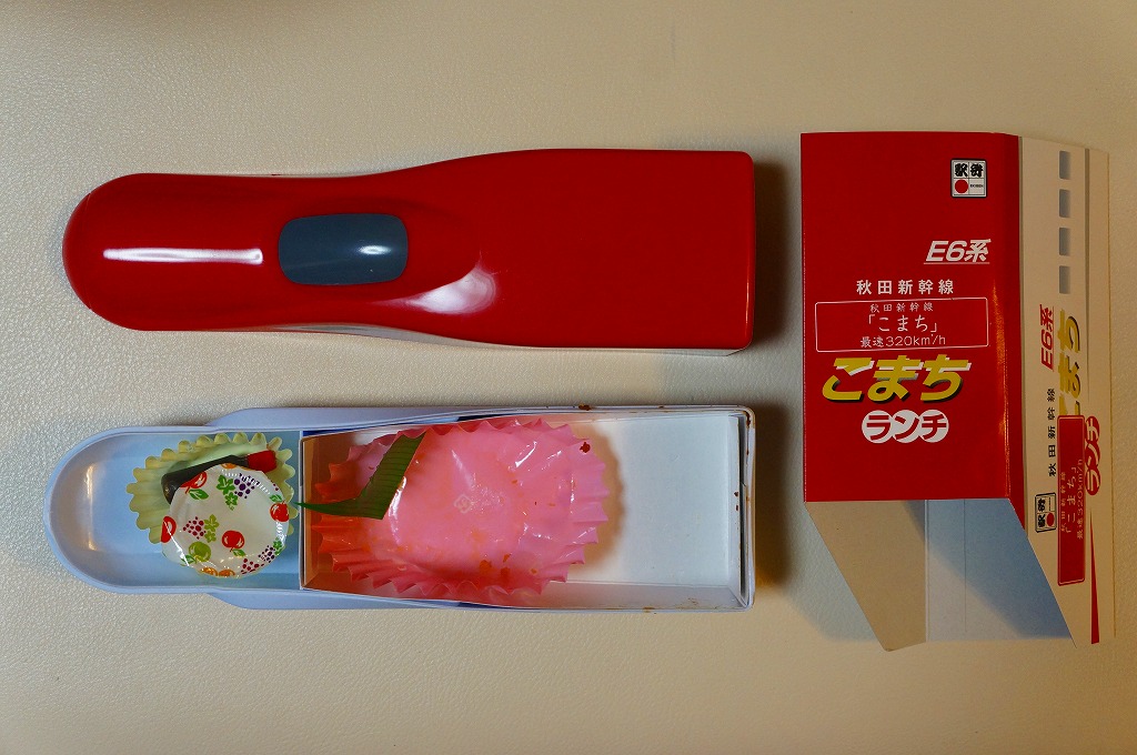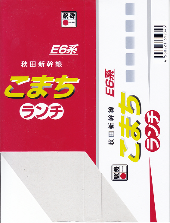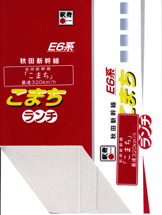 上記の駅弁「E6系こまちランチ」の、2013年の発売当時の姿。容器も中身も価格も同じで、名前だけが違う。2013(平成25)年3月から1年間だけ、秋田新幹線の列車名は、E3系電車を使う「こまち」と、E6系電車を使う「スーパーこまち」の2種類があった。E3系の引退とE6系への統一により、「こまち」の1種類に戻った。