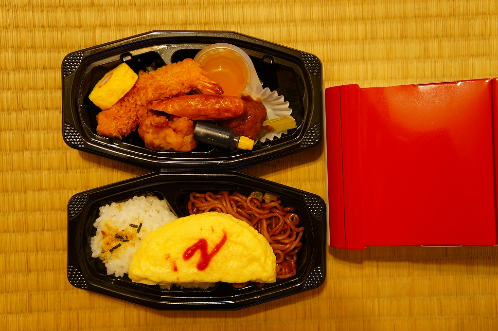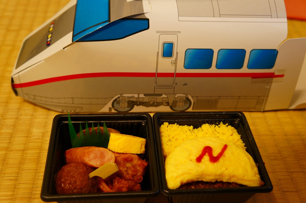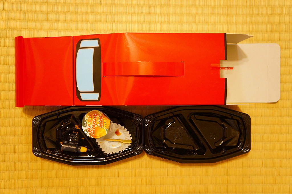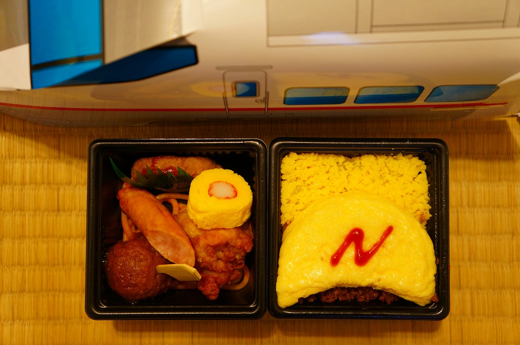 中身は白御飯を、エビフライ、ウインナー、チキンナゲット、ハンバーグ、オムレツ、やきそば、とりそぼろで覆うもの。これもまた、過去の東の新幹線の先頭車を容器にした駅弁と同じく、中身だけを取り上げればチープでうまくないお子様ランチ。容器を買う駅弁である。