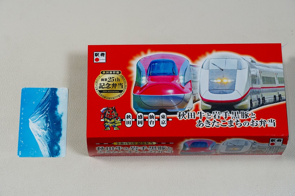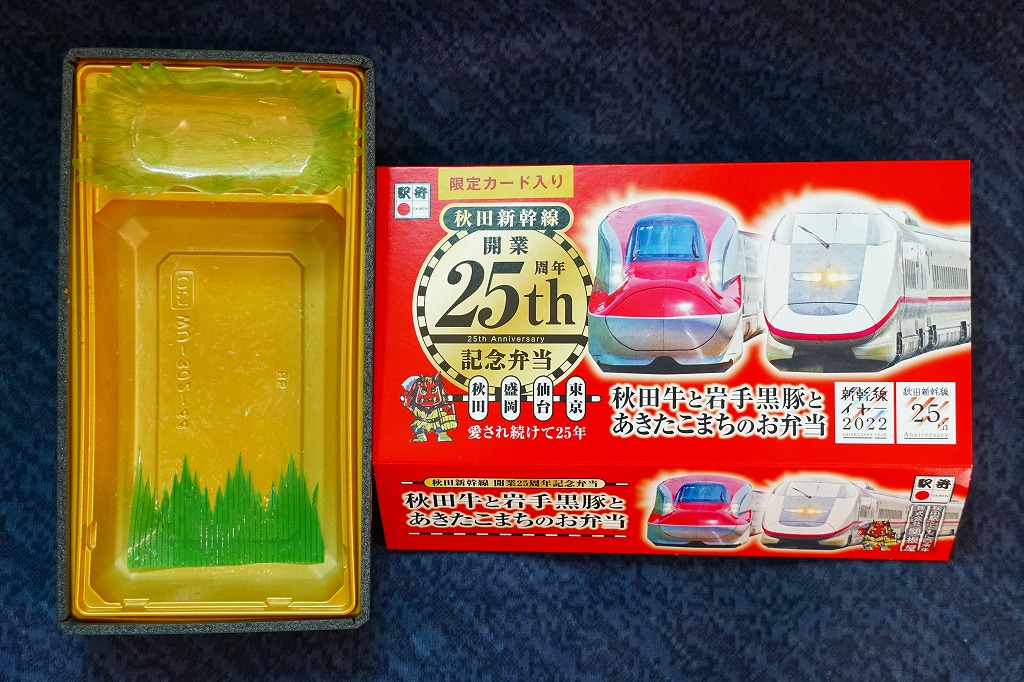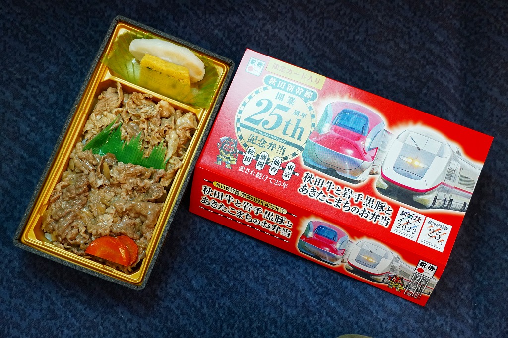 上記の駅弁「秋田牛と岩手黒豚とあきたこまちのお弁当」の、2022(令和4)年の発売時の発売時の姿。容器や中身は、上記の2025年のものとほぼ変わらない。当時のスリーブでは、「秋田新幹線開業25th周年記念弁当」の丸印が大きく、秋田新幹線25thと書かれたロゴマークもあった。中身のうちいぶり大根漬は、いぶり人参漬だった。
