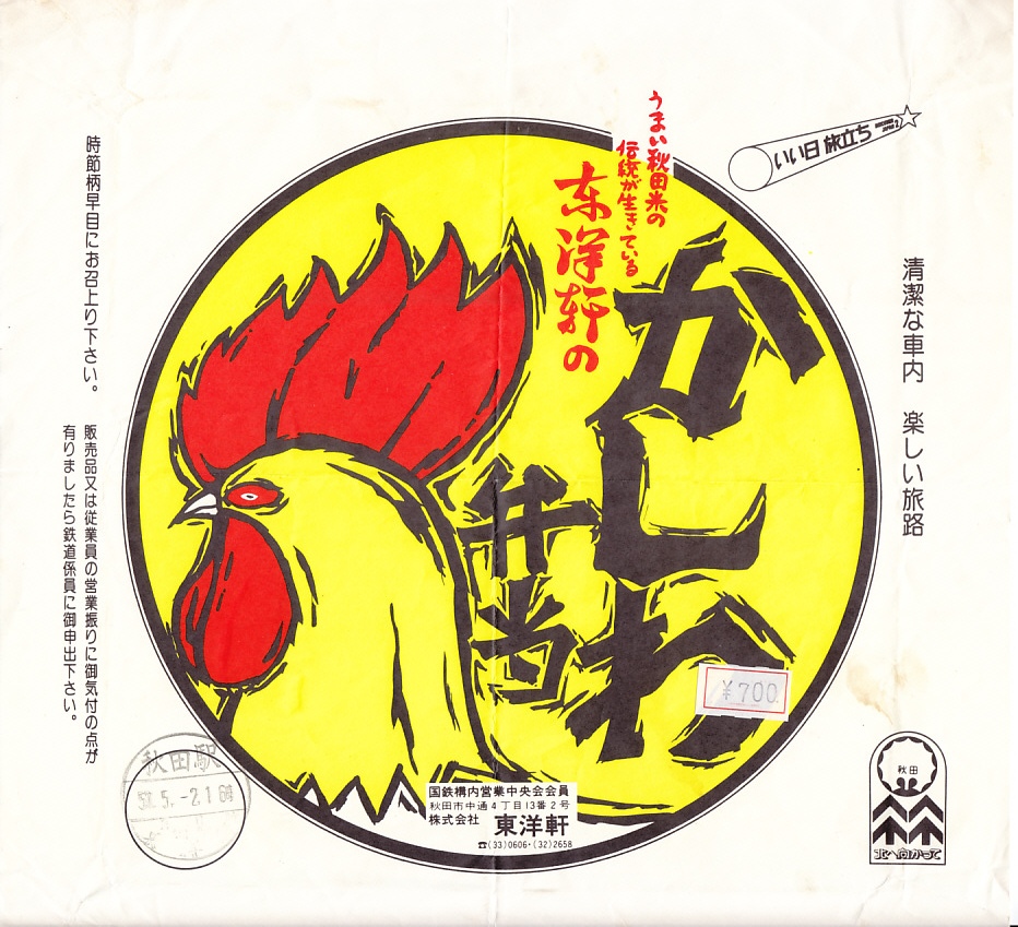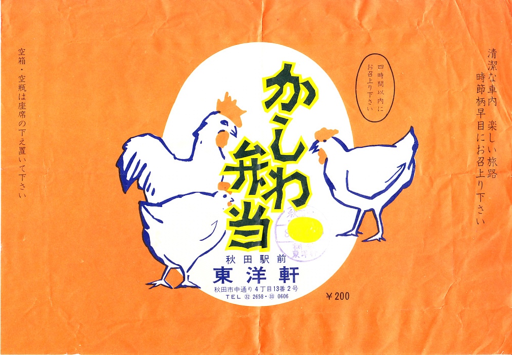 1960年代のものと思われる、昔の秋田駅弁の掛紙。九州や西日本でなく秋田にあった、鶏を「かしわ」と呼ぶ駅弁。当時は仙台駅にも同じ名前の駅弁があり、それら以外に事例があるかどうか。ニワトリの絵柄なので、かしわが何か分からなくても中身を想像できる。
