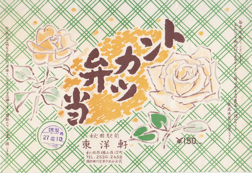 1960年代の、27日10時の調製と思われる、昔の秋田駅弁の掛紙。トンカツとは全然関係ないと思う、バラの絵柄。