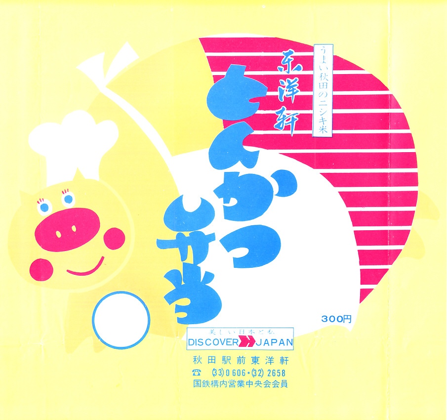 1970年代のものと思われる、昔の秋田駅弁の掛紙。300円の価格から、1973年頃のものか。丸々太ったブタがかわいらしい、中身の食材を表現した絵柄。