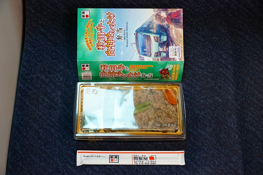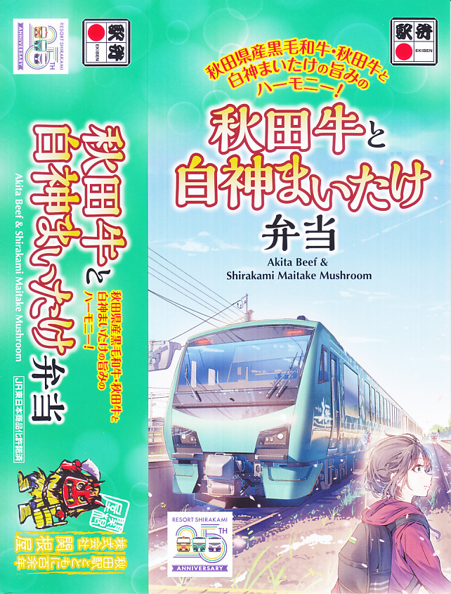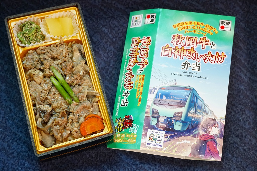 東京駅の駅弁売店「駅弁屋 祭」での、2022(令和4)年の駅弁の日にちなむ4月6〜19日の「春の新作駅弁大会」において発売か。スリーブの絵柄は秋田駅と五能線を結ぶ観光列車「リゾートしらかみ」で、その25周年ロゴマークがいくつもあるので、これを記念した駅弁だろうか。白飯を秋田牛と白神まいたけとささがきごぼうの煮物で覆い、いぶり人参漬とアスパラで彩り、こごみ胡麻和えとりんごコンポートを添える。秋田駅で量がやや物足りない牛肉弁当に、マイタケで増量し水気と柔らかさを加え、食べ応えを加えた印象。値段がずいぶん張るなとは思う。2023年3月限りで終売。