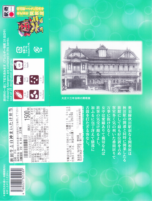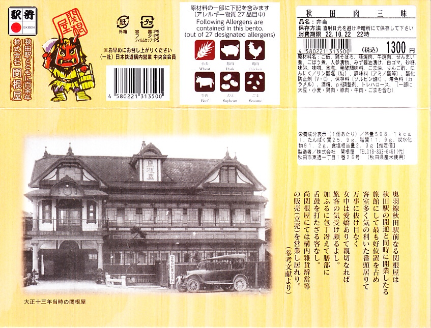 東京駅から新幹線こまち号で約4時間。秋田市は秋田県の中央で日本海に面した、人口約29万人の城下町で県庁所在地。北前船以来の港町でもあり、油田を抱えた工業都市でもあり、以前は商業でも賑わった。駅弁は明治時代の末期までに関根屋が売り始め、以後は大正時代から21世紀までいくつもの業者が進出しては消え、今は関根屋と大館駅の駅弁が駅のコンビニで売られる。1902(明治35)年10月21日開業、秋田県秋田市中通7丁目。