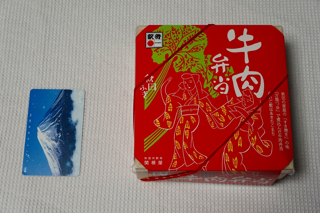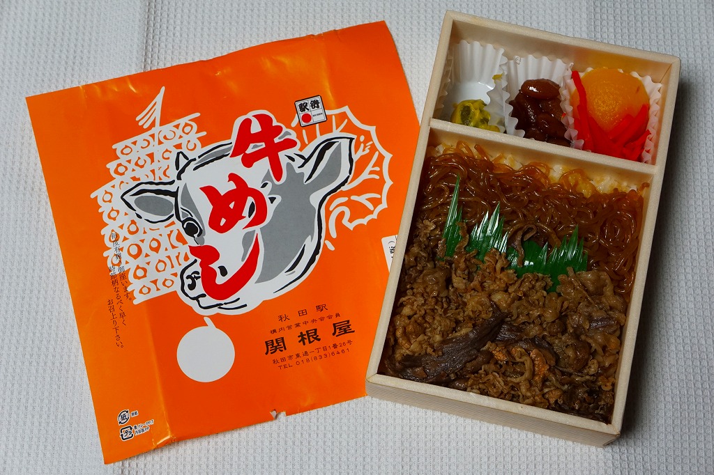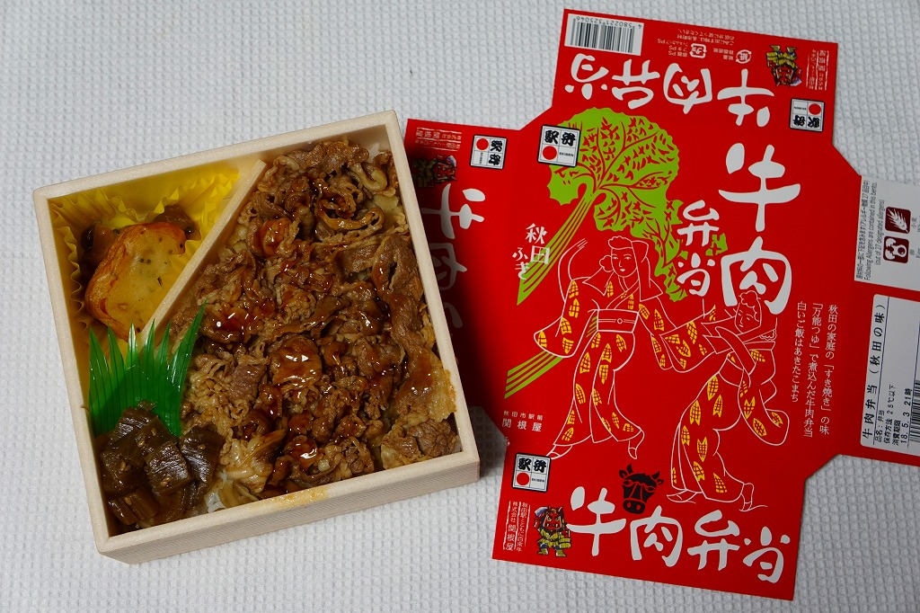 2017(平成29)年12月までに発売か。駅弁の名前は「牛肉弁当(秋田の味)」や「秋田の味牛肉弁当」ともいわれ、掛紙の絵柄にはないが、食品表示ラベルに「秋田の味」という副題が見える。正方形の容器に白飯を詰め、牛肉煮で覆い、タレをかけ、フキ油炒め、揚げかまぼこ、煮豆などを添える。味は甘辛のタレが卓越。フキの油炒めは駅弁では初めて食べたと思う、全体的に普通の牛肉駅弁。赤いふたを読むと秋田駅の駅弁に見えるが、どうもこれは東京都の東京駅や上野駅でしか買えない模様。現地には以前から下記の「牛めし」がある。2022年に終売か。