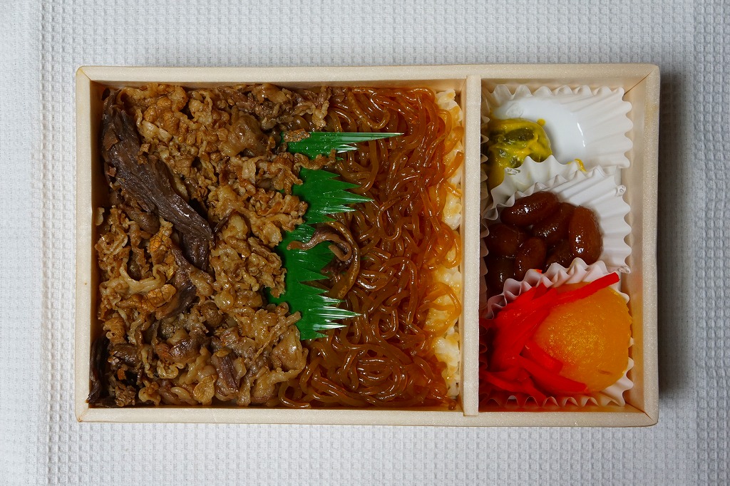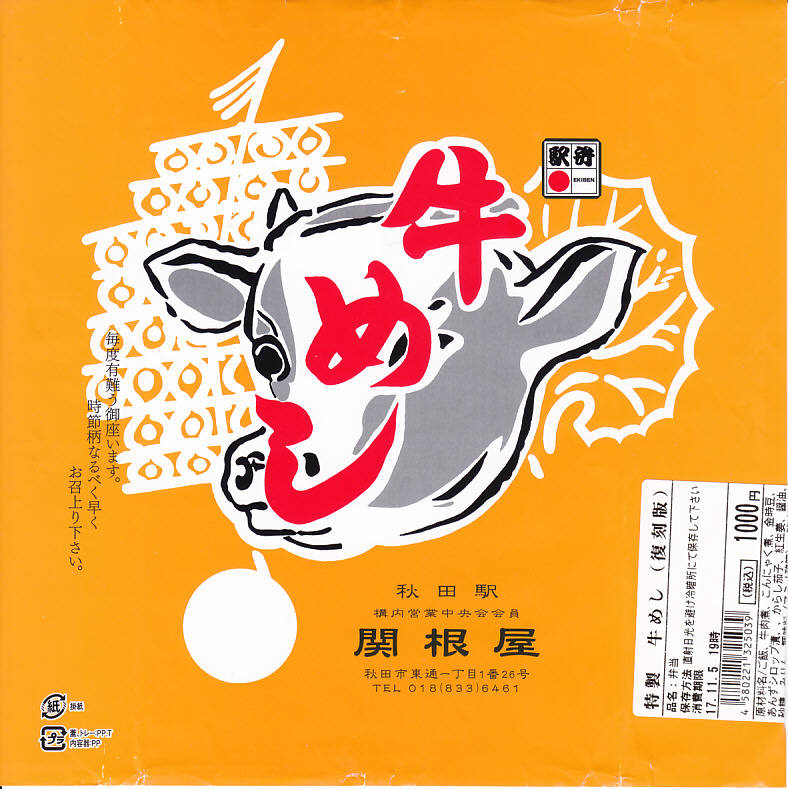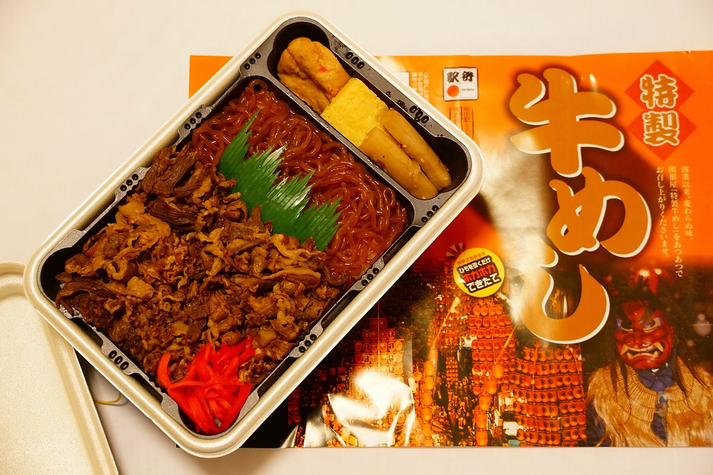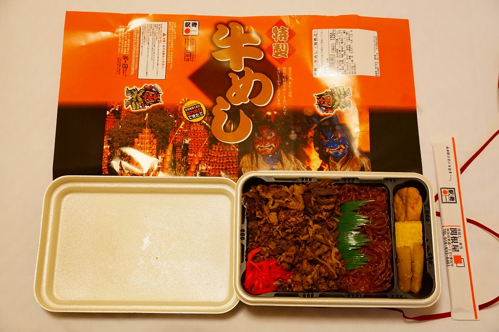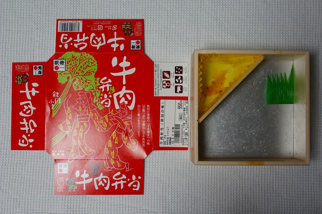 秋田駅の牛肉駅弁。駅弁屋の創業時の1902(明治35)年に発売と紹介されることがあるが、文献で確認できる駅弁の歴史を、1920年頃の鶏肉から始まる肉駅弁の歴史を鑑みると、どうも信じがたい。白飯を牛肉煮と糸こんにゃくで覆い、こんにゃく、ごぼう、昆布、がんも、ぜんまい、紅生姜、あんずシロップ煮を添える。特徴の薄さが特徴かもしれない、色の濃い、味の濃い、ちょっと古めかしい牛すき焼き丼。価格は2014年の購入時で950円、2018年時点で1,000円、2022年3月から1,100円、2024年9月から1,280円。