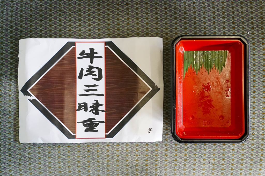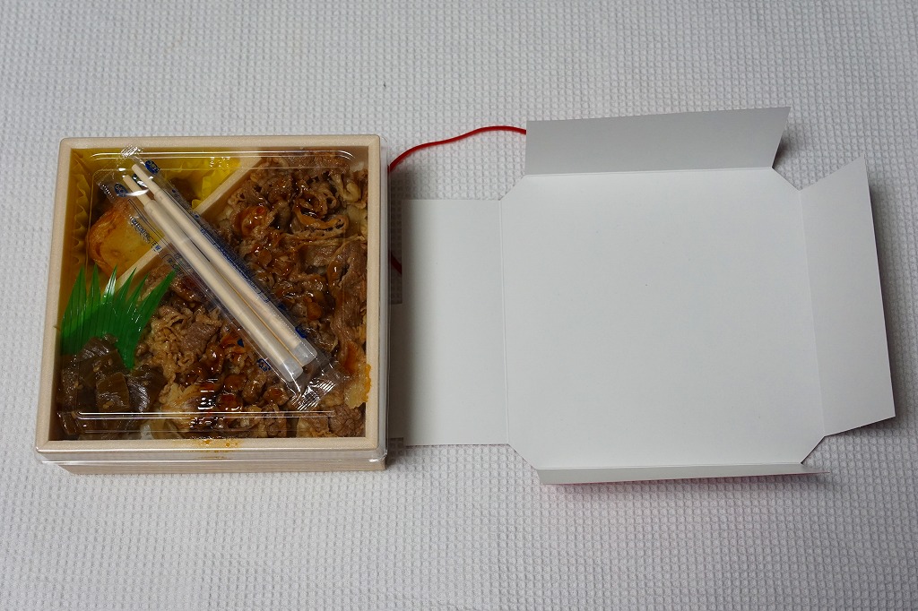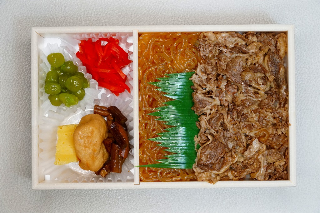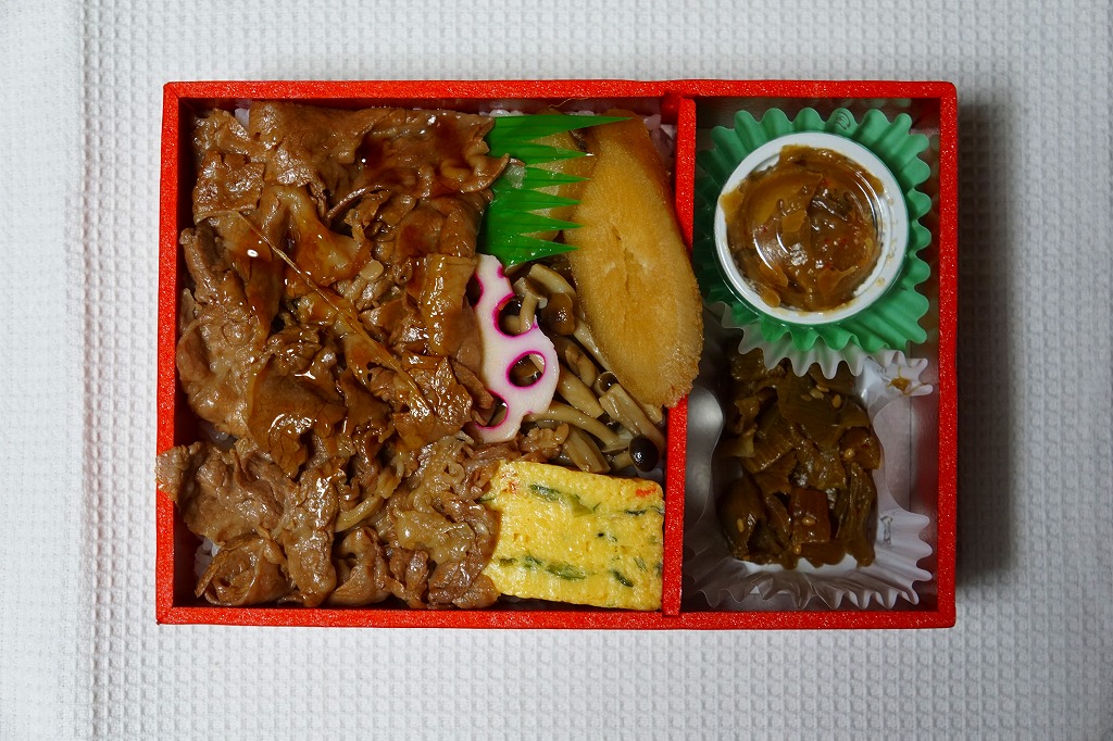 秋田駅の牛肉駅弁。駅弁屋の創業時の1902(明治35)年に発売と紹介されることがあるが、文献で確認できる駅弁の歴史を、1920年頃の鶏肉から始まる肉駅弁の歴史を鑑みると、どうも信じがたい。白飯を牛肉煮と糸こんにゃくで覆い、こんにゃく、ごぼう、昆布、がんも、ぜんまい、紅生姜、あんずシロップ煮を添える。特徴の薄さが特徴かもしれない、色の濃い、味の濃い、ちょっと古めかしい牛すき焼き丼。価格は2014年の購入時で950円、2018年時点で1,000円、2022年3月から1,100円、2024年9月から1,280円。