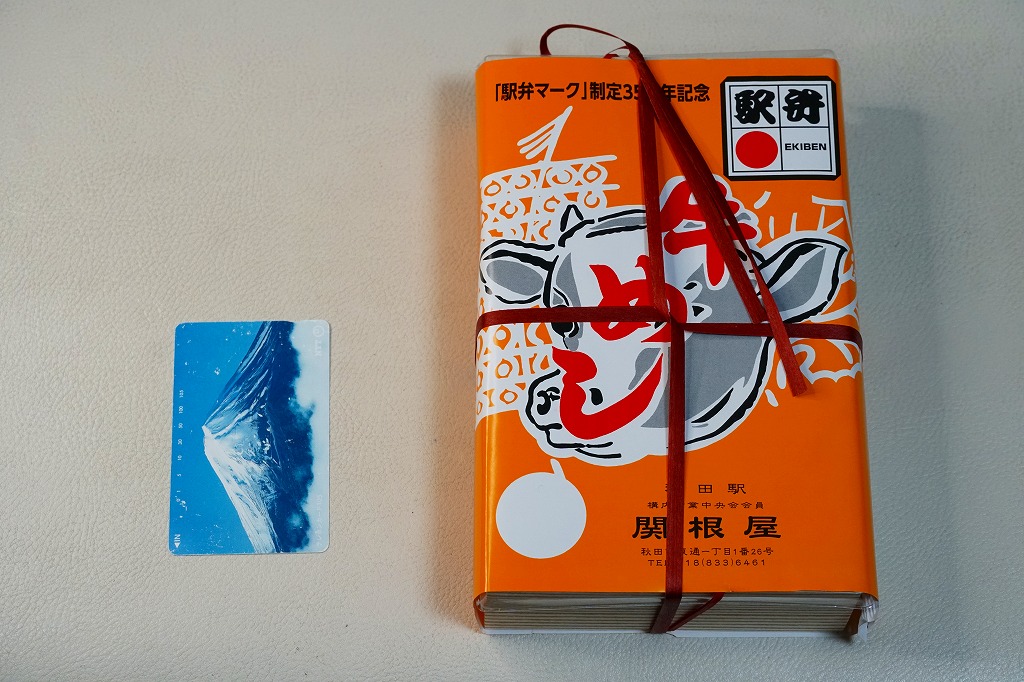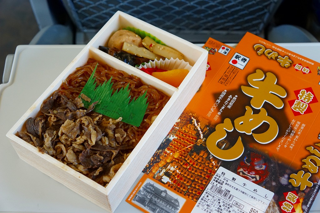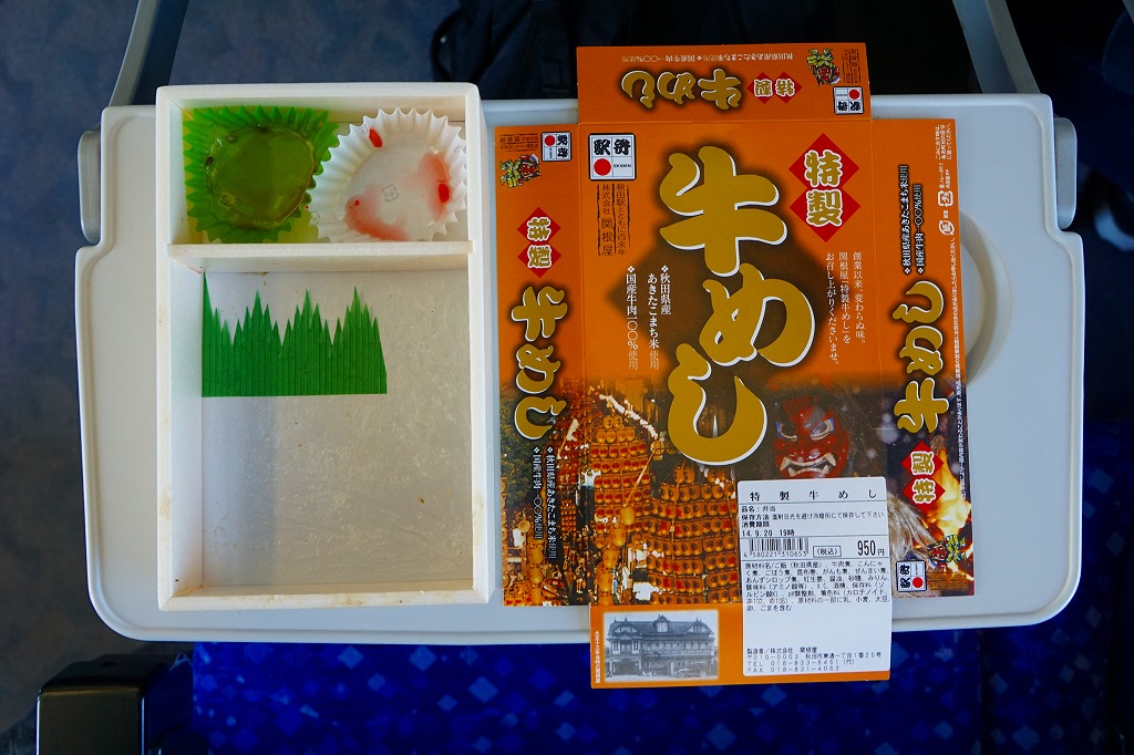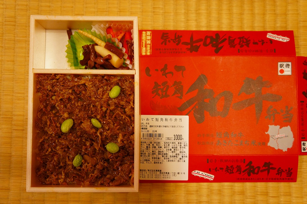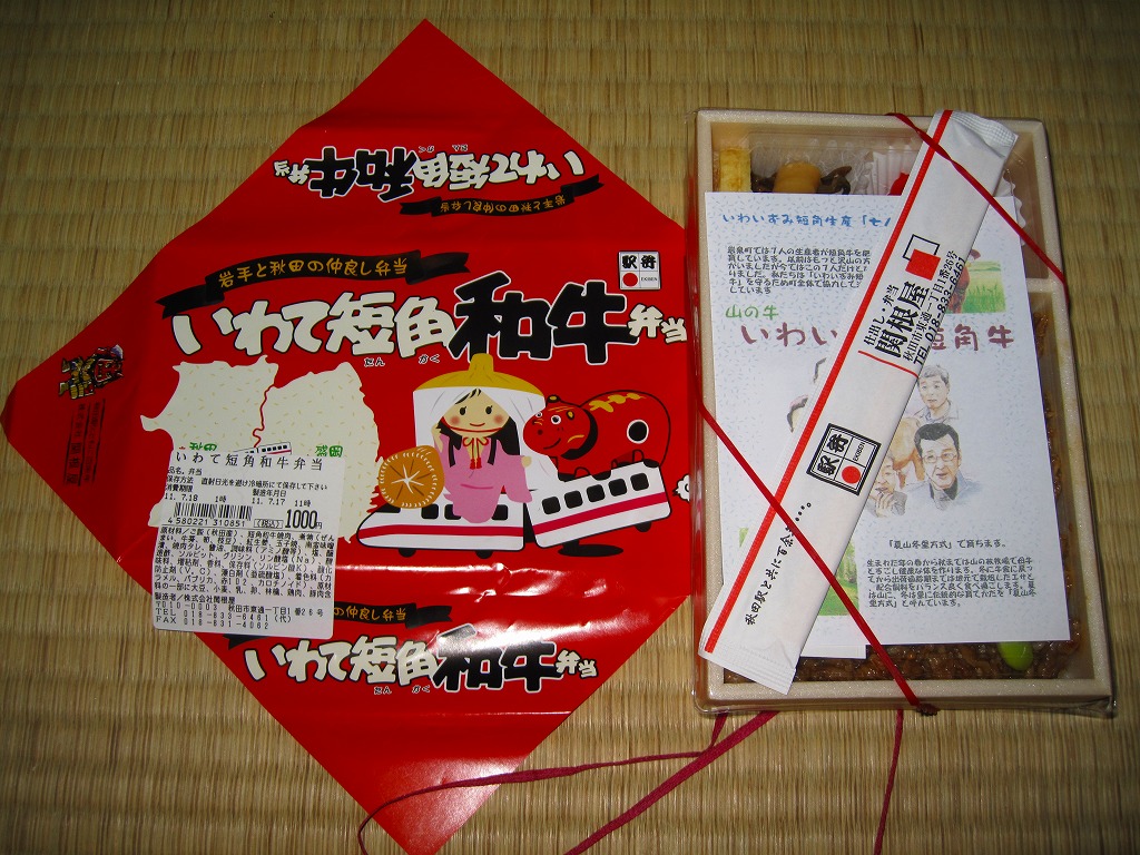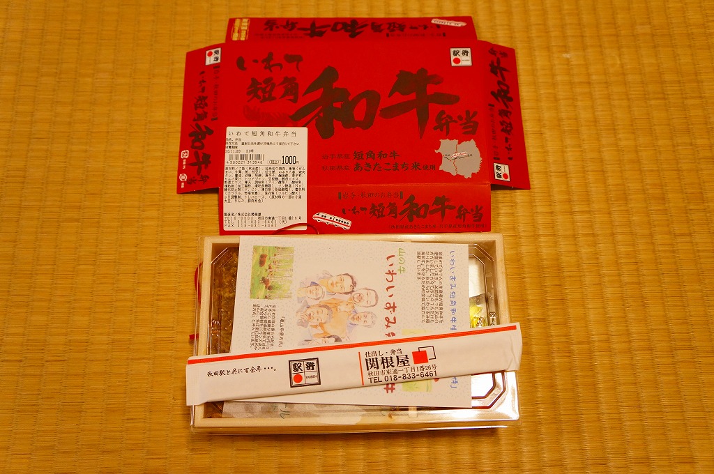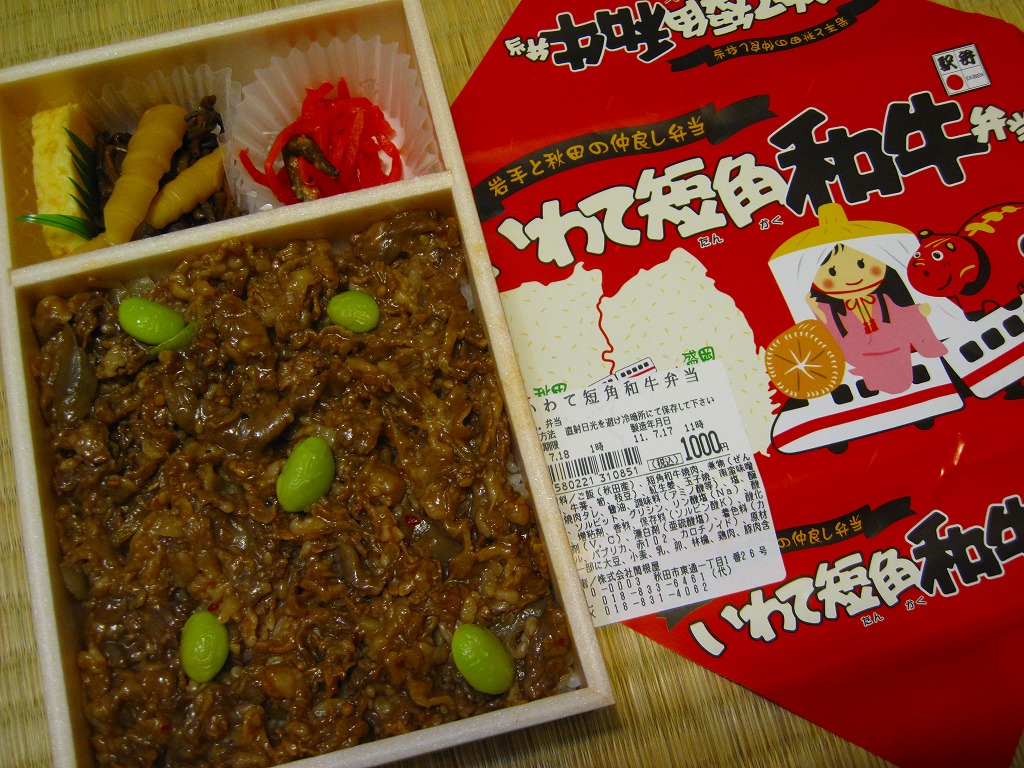 2011(平成23)年5月の発売。秋田新幹線の開業15周年でも記念したのだろうか。長方形の容器に透明なふたをして、駅弁の名前を墨字で著した赤黒いふたをさらにかける。中身は白御飯の上を岩手県岩泉の短角牛の焼肉で覆い、ゼンマイやいぶりがっこなどを添えるもの。容器も中身も米沢その他の東北地方各地の牛肉駅弁と同じ感じだが、ぐにゅっとした肉の視覚と味覚での脂が印象的。価格は2013年の発売時や購入時で1,000円、2014年時点で1,050円。2014年頃までの販売か。