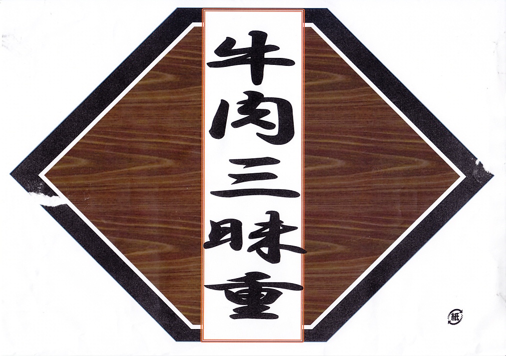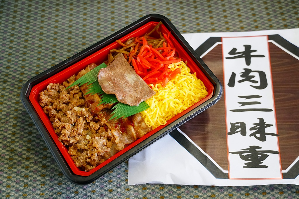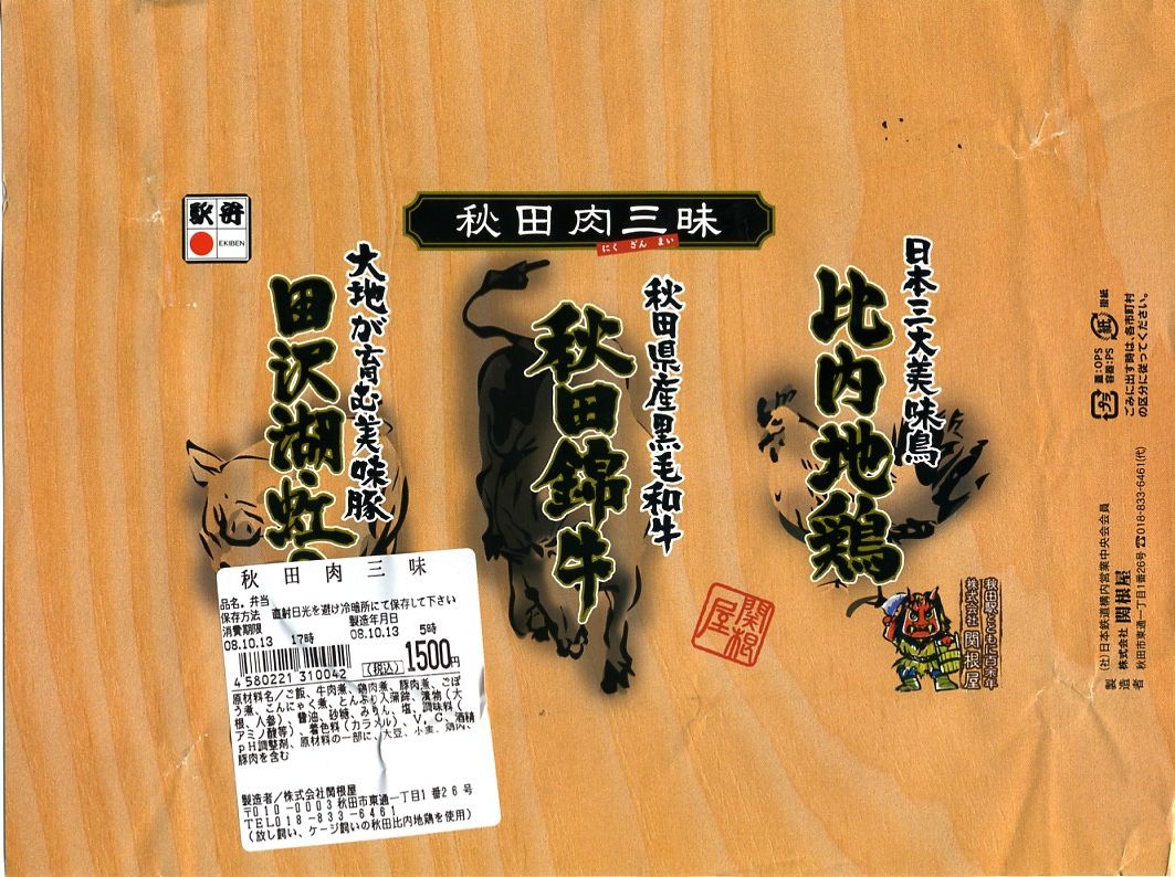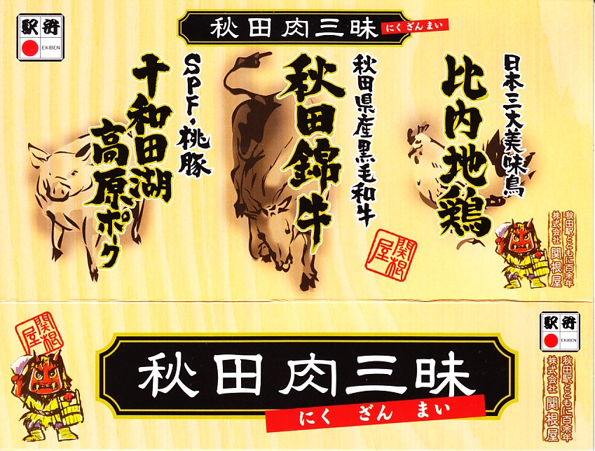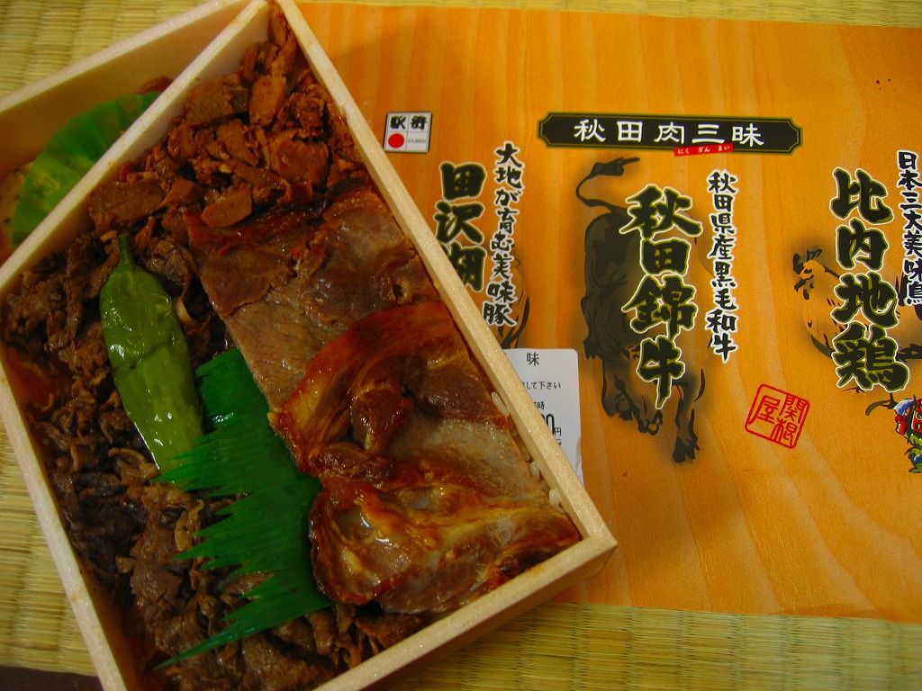 2008(平成20)年10月12・13日の両日に東京駅構内で開催された「東日本縦断駅弁大会−秋−」で販売されたお弁当で、全8種が誕生した「メガ駅弁」のひとつ。長方形の容器に透明なふたをかけて、商品名と肉の名前にそのイラストを書いた掛紙で包み、ひもで十字にしばる。中身は白御飯に上に田沢湖紅の豚のスライスと、秋田錦牛のすき焼きと、比内地鶏のフレークが、それぞれ色濃く煮られて敷き詰められるもの。味付けが似ているから、肉を混ぜても混ざっても、風味に違和感はなかった。