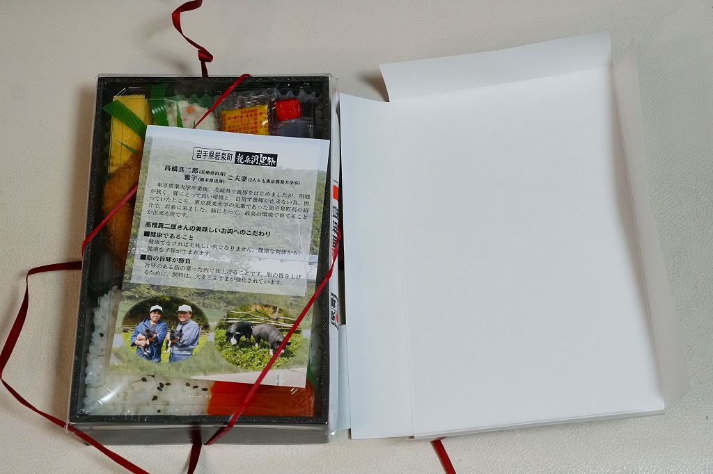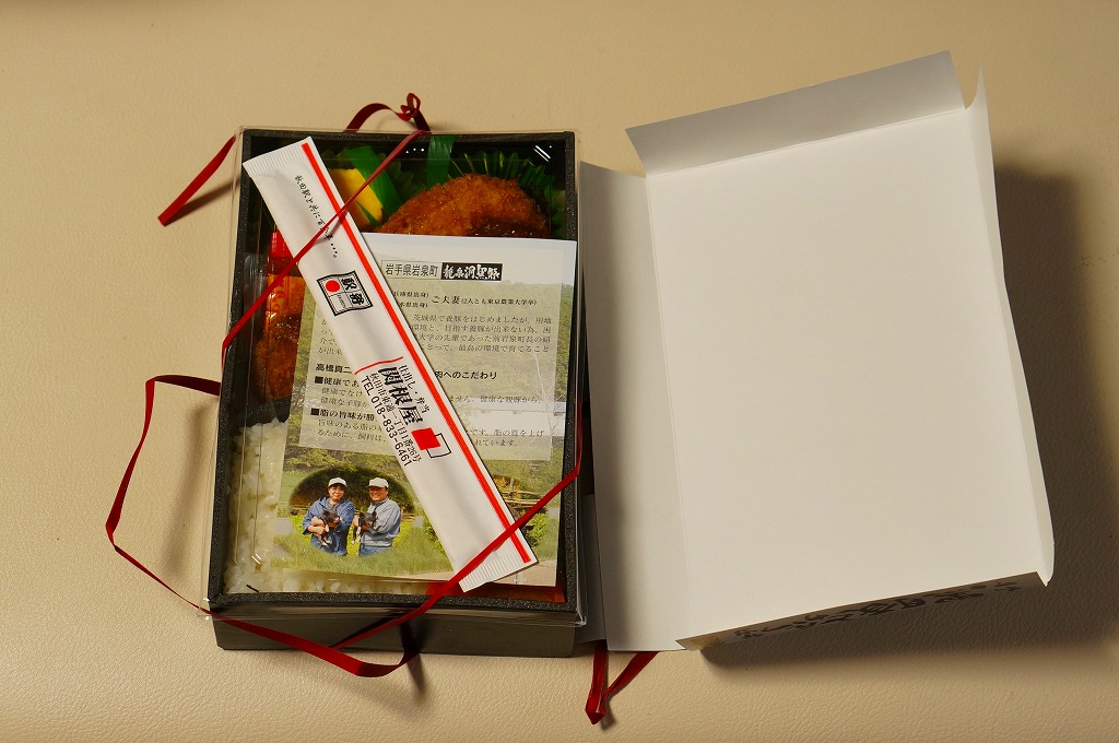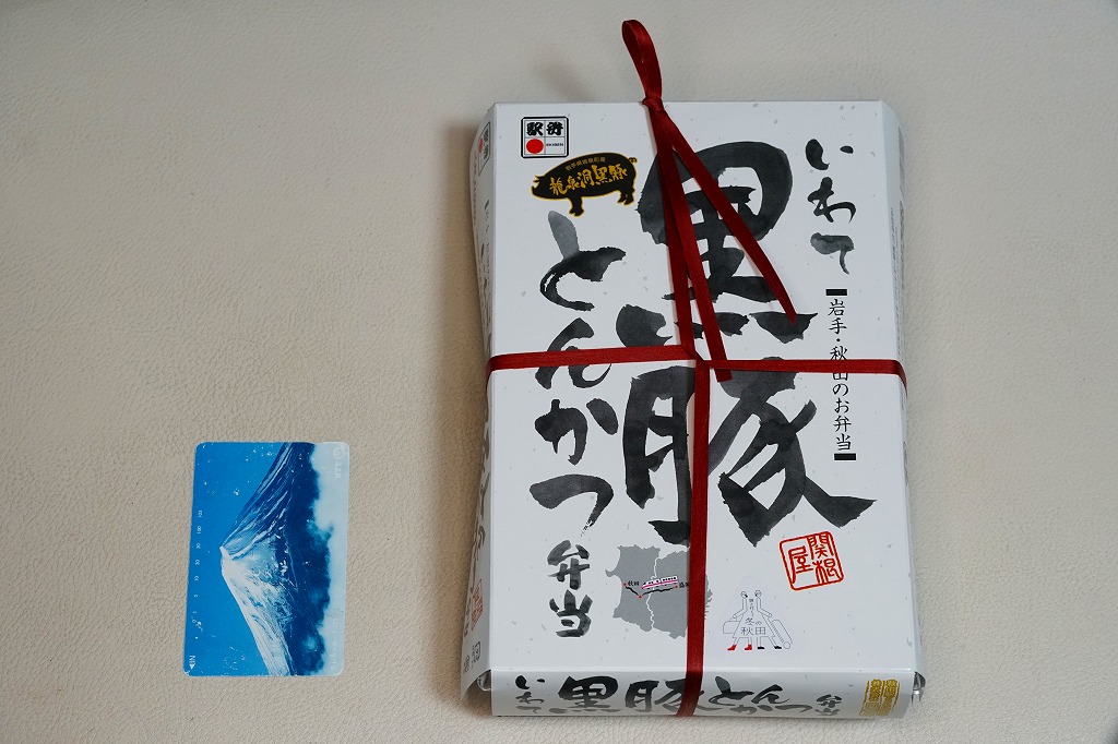 2014(平成26)年の秋に秋田駅や東京駅で発売か。駅弁の名前に「いわて」とあり、岩手県岩泉町の畜産業者がつくるブランド豚の使用をうたいながら、これは岩手県や盛岡駅の駅弁でなく、秋田県の秋田駅の駅弁屋の商品。日の丸御飯とトンカツ1枚に、ソース、玉子焼、ポテトサラダ、大根漬物などを添える。価格は2015年の購入時で1,000円、2019年時点で1,080円、2022年3月から1,150円、2024年9月から1,200円。