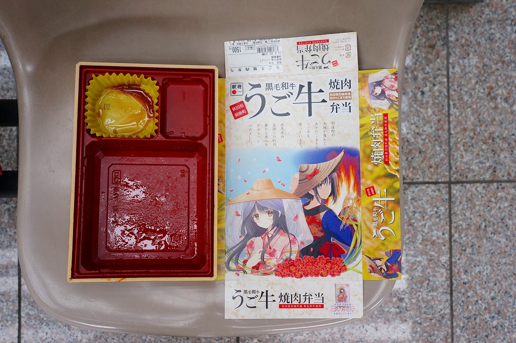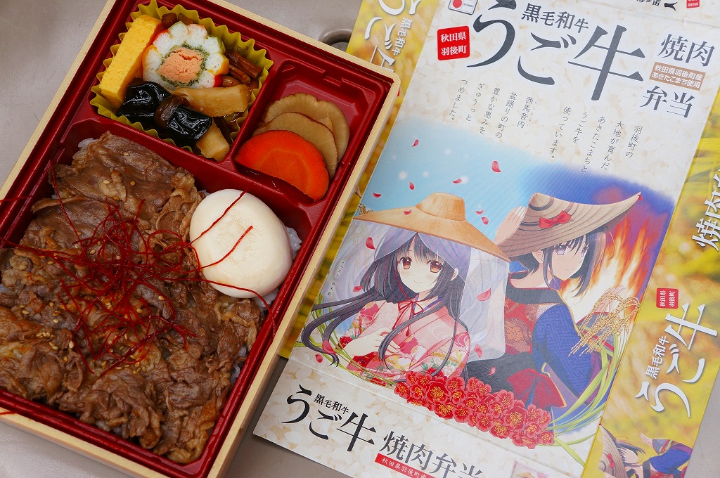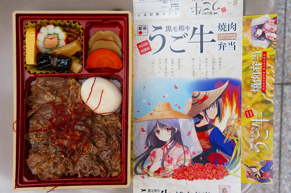 秋田駅中央改札口のコンビニエンスストア「NEWDAYS秋田中央口店」のリニューアルを記念して、2013(平成25)年4月26日に発売。長方形のプラ製容器の中身は、秋田県雄勝郡羽後町産の白御飯を、同町のうご農業協同組合のブランド牛「うご牛」の焼肉で覆い、卵、太鼓かまぼこ、ネギ入りの玉子焼、ゼンマイとゴボウの煮物、昆布巻、いぶりがっこを添えるもの。