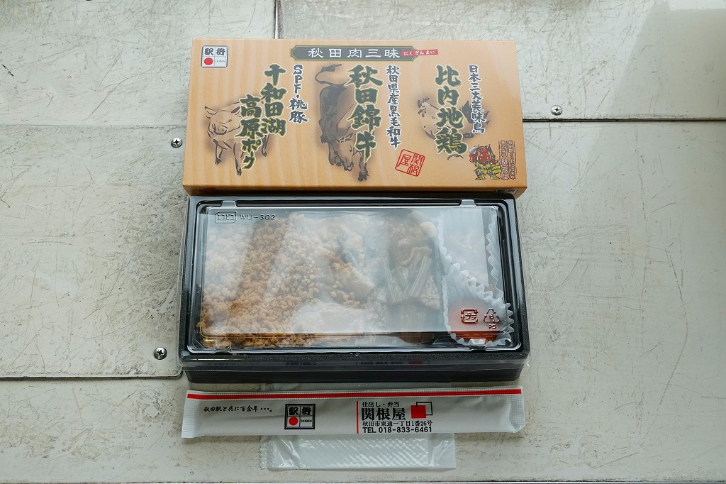 中身はあきたこまちの白飯を、豚焼肉と牛焼肉と鶏そぼろで覆い、ぜんまい、ごぼう、にんじん、みずを添えるもの。3種類のお肉に、スリーブに書かれたブランド肉が使われるのだろう。秋田で固めた肉と肉と肉の力強い駅弁と思えるか、肉三昧を名乗るには分量も風味も肉がおとなしすぎると思うか。価格は2010年頃で1,100円、2016年時点で1,150円、2022年時点で1,300円、2024年時点で1,380円。