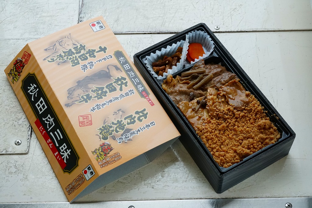 2009(平成21)年の秋までに発売か。その前年の2008年10月に、東京駅で2日間限りのイベント向け駅弁として販売した「秋田肉三昧・大盛」の好評を受け、分量を通常の適量サイズに変更して再度発売したのだという。長方形の容器を収めたスリーブには、豚や牛や鶏のイラストとともに「十和田湖高原ポーク」「秋田錦牛」「比内地鶏」と力強く記され、その底面では写真と文章で大正時代の調製元を紹介する。