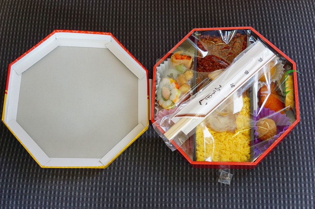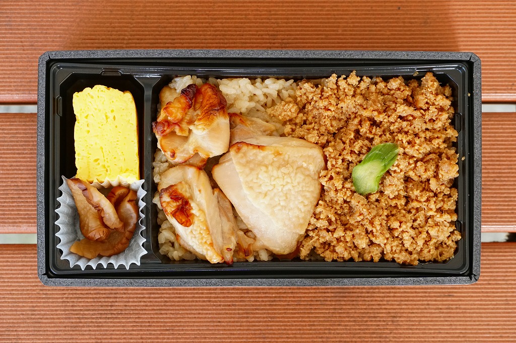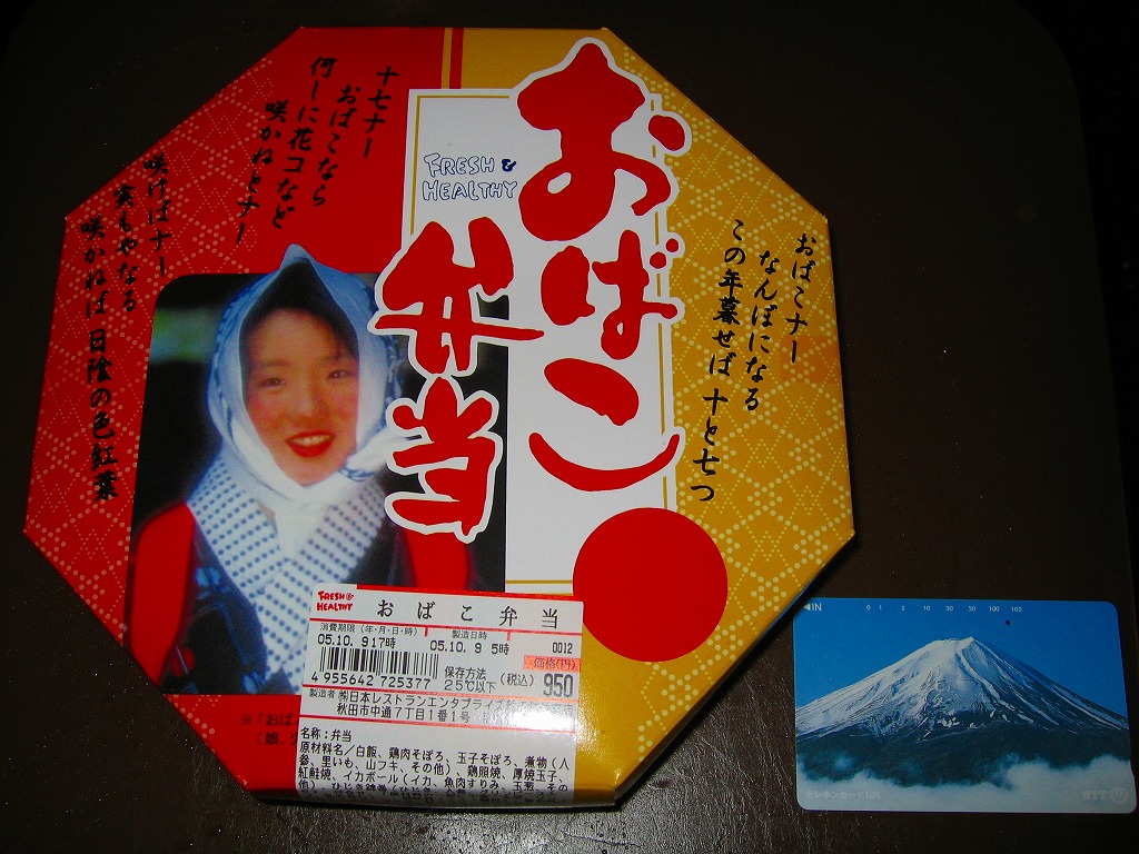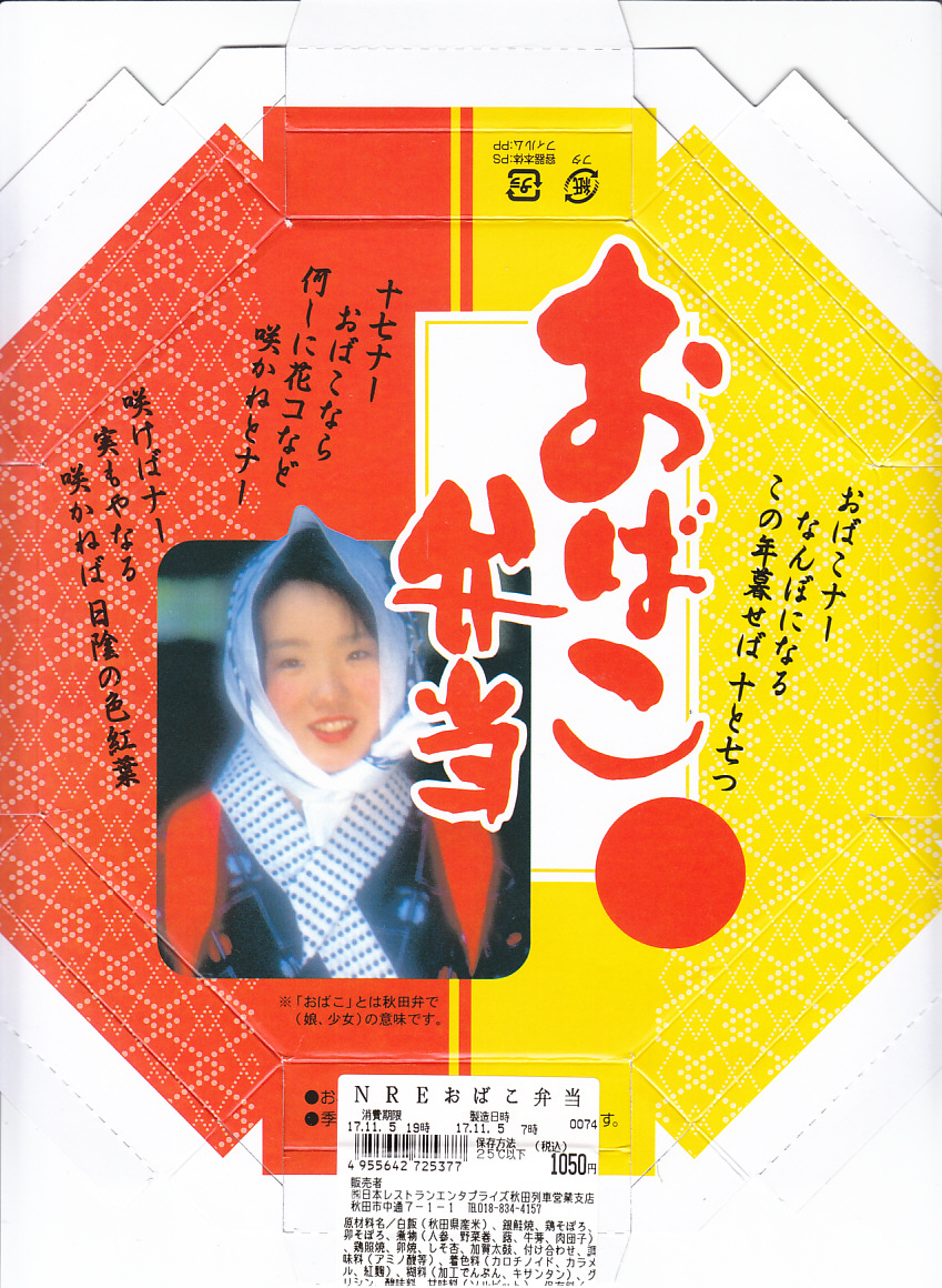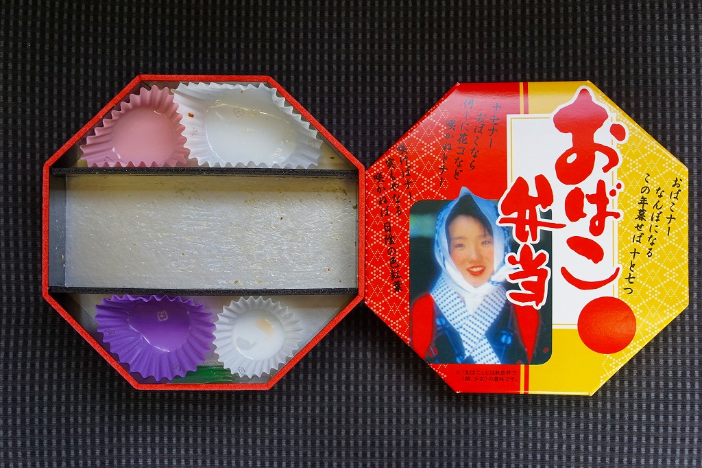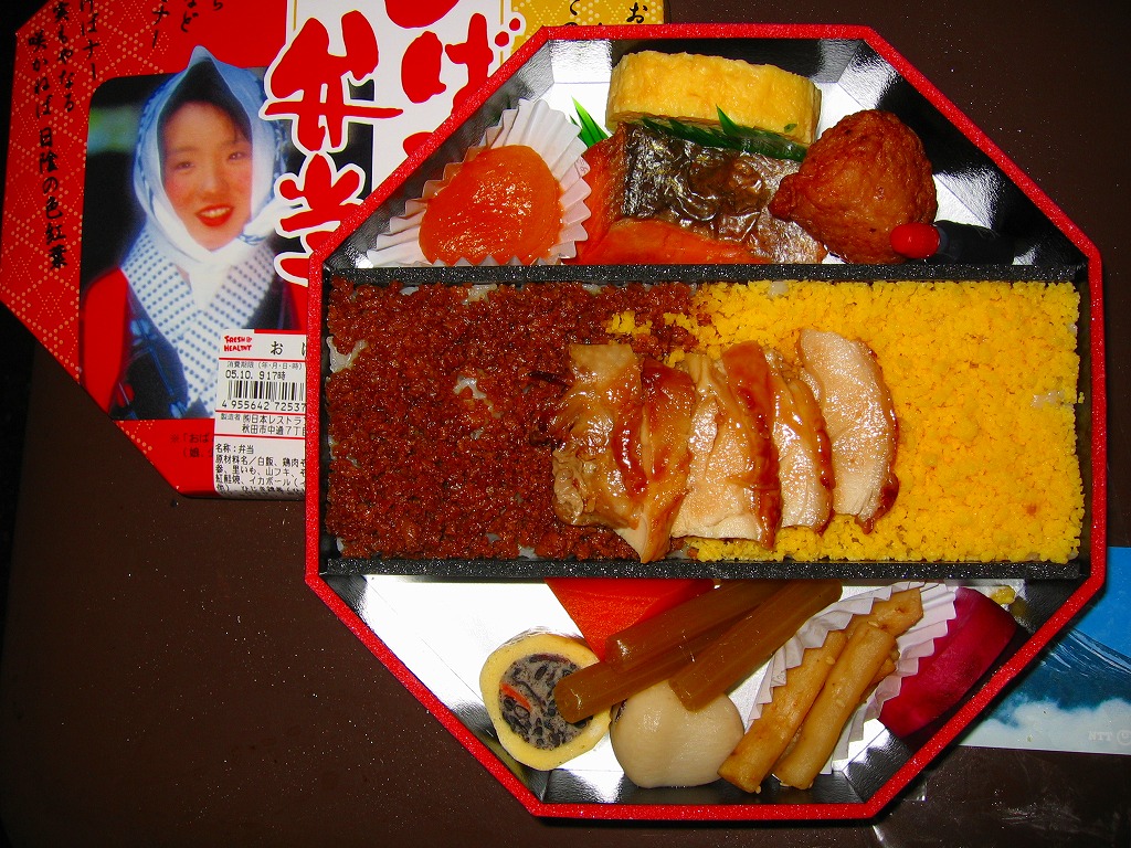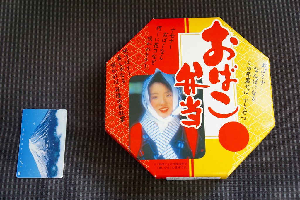 「おばこ」とは秋田弁で少女という意味。秋田美人の写真がふたを飾る。その正八角形のふたを開けると、平行な対角線で3分割された真ん中に、鶏照焼・鶏そぼろ・錦糸卵が載るとりめし、その上下に焼鮭、肉団子、玉子焼、煮物や漬物などを配置する。おばこ弁当=「少女弁当」=女性向けと思うと、ボリュームがありすぎる。長い名前の販売元は、つまり以前の日本食堂。同社が2019(平成31)年3月限りで秋田から撤退し、この駅弁もなくなった。