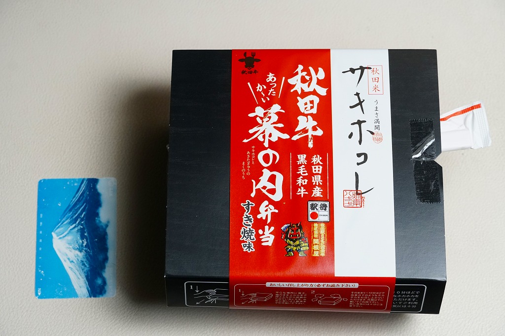 2024(令和6)年12月6日に秋田駅などで発売。JR東日本秋田支社が展開する秋田県冬の大型観光キャンペーン「誰と行く?冬の秋田」に合わせたオリジナル商品として、2025年2月28日までの期間限定で販売。ここでは4月にも買えたので、そのまま売り続けているのだろう。調製元の公式サイトによると商品名は「サキホコレと秋田牛のあったかい幕の内弁当」であるが、その名は現物のどこにも見られない。