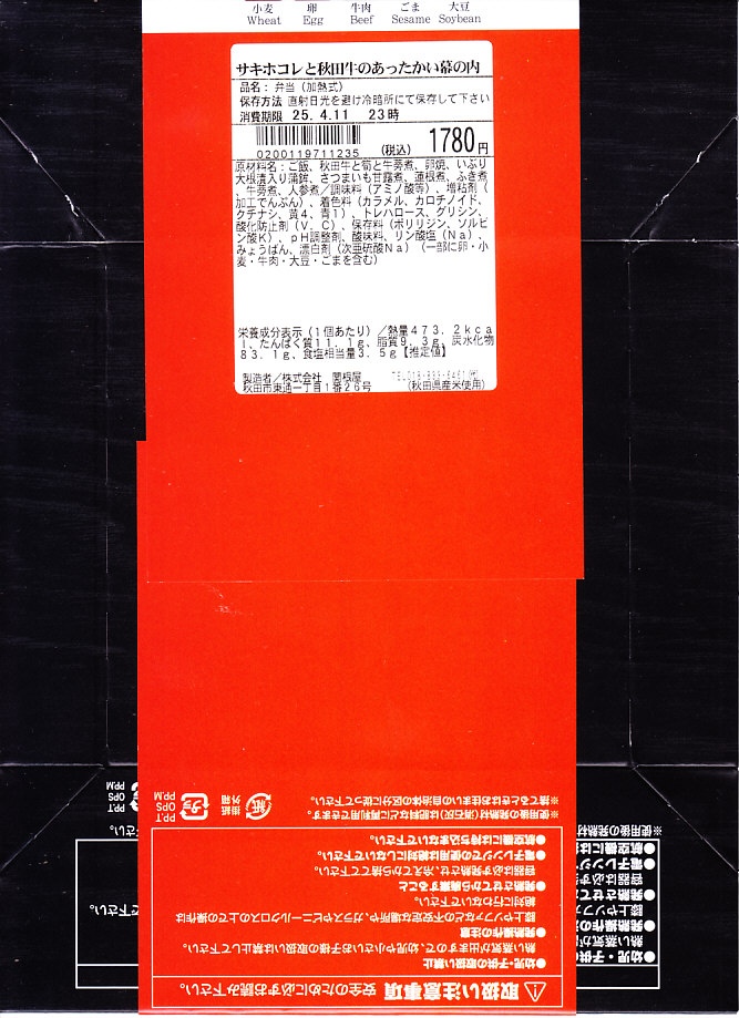 丸い加熱機能付き容器「ナルホット」用の、業務用市販品そのままの黒いスリーブに、商品名などを記した赤い掛紙を巻く。中身は秋田米サキホコレの白飯、秋田県産黒毛和牛とたけのことごぼうの煮物、玉子焼き、ふき煮、れんこん、いぶり大根漬入りかまぼこ、さつまいも甘露煮。お肉控えめの牛肉弁当で、見た目も味でも御飯が主役。