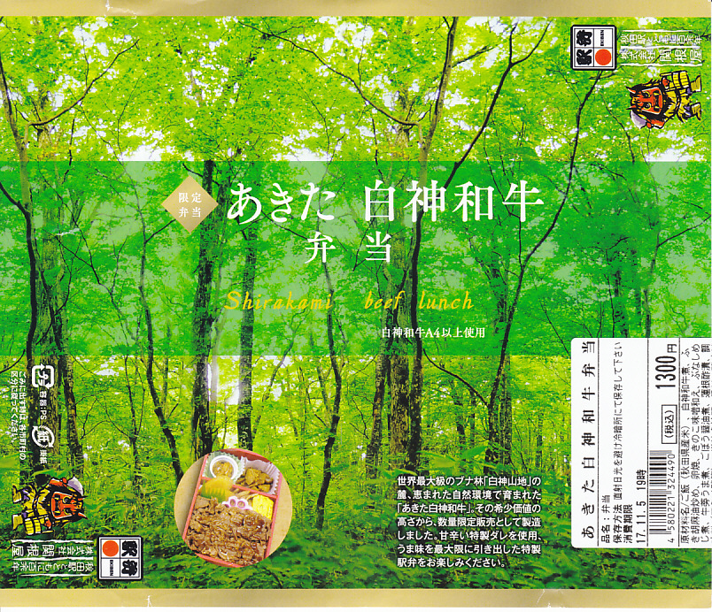 世界自然遺産である白神山地の美しいブナ林の写真を掛紙に使う。中身は白御飯を白神和牛煮と、ごぼう、ぶなしめじ煮、玉子焼で覆い、きのこ味噌和えとフキ胡麻油炒めを添えるもの。同じ日に買った古い上記の駅弁「牛めし」と違い、こちらは見ても食べても今風に美しい牛肉駅弁。2019年までの販売か。