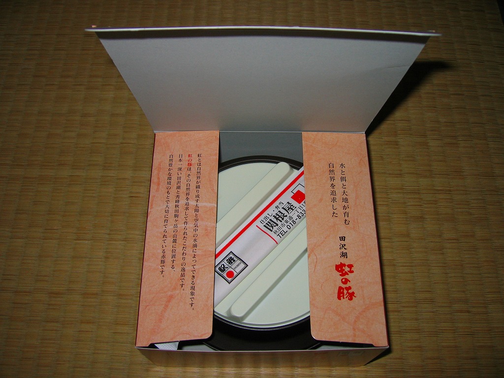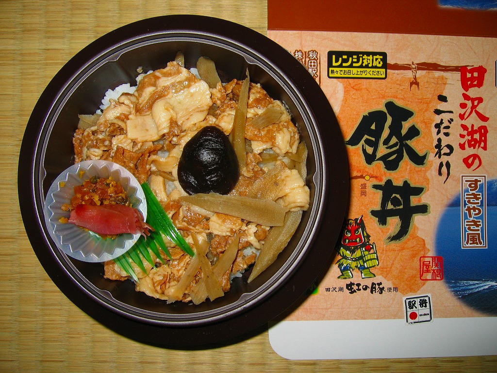 秋冬の駅弁大会シーズンに向けた、2009(平成21)年秋の新商品か。電子レンジ対応のプラ製釜型容器を、駅弁の名前や田沢湖の写真を載せたボール紙の箱に詰める。中身は白御飯の上に「紅の豚」の名が付いた豚肉の少々厚い薄切りを煮たものを、ささがきごぼうと混ぜて載せて、シイタケとミョウガなどを添えるもの。
