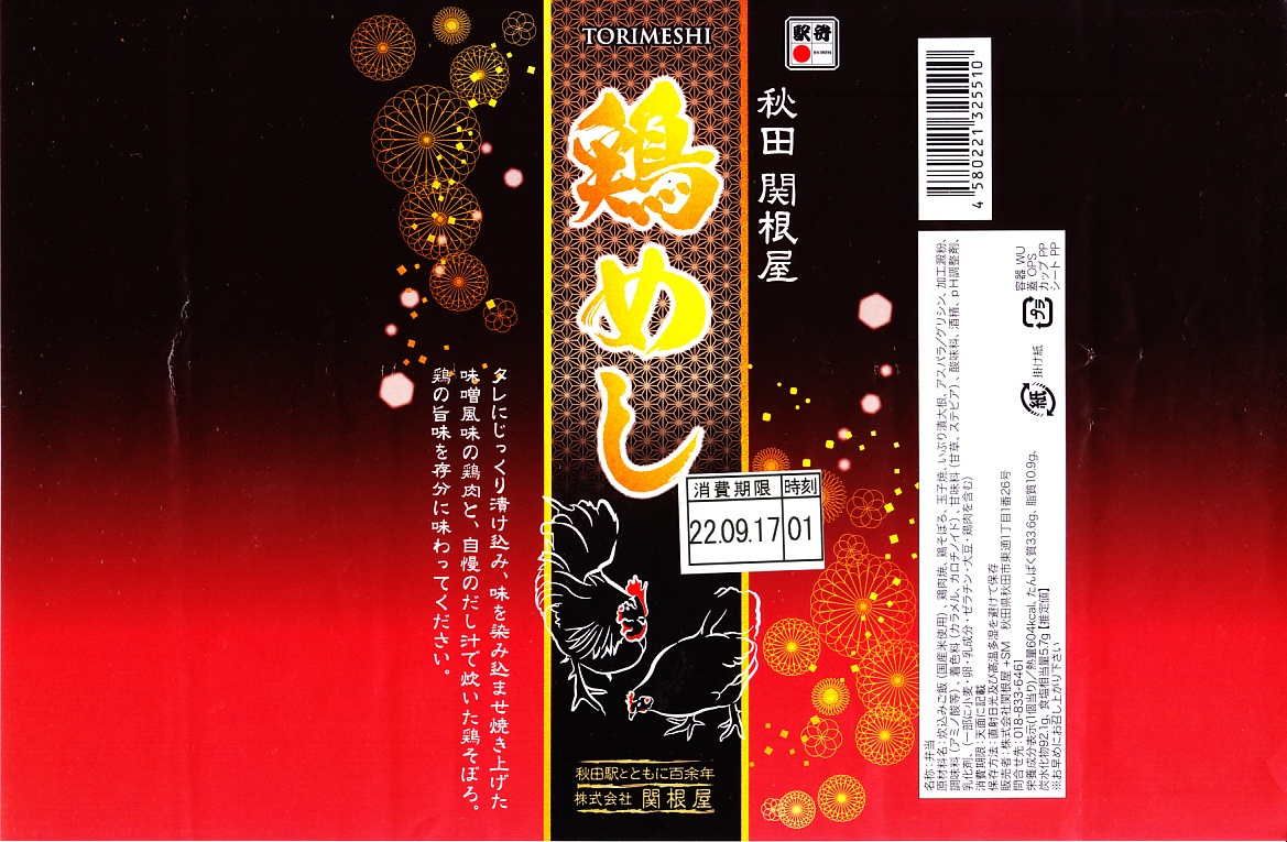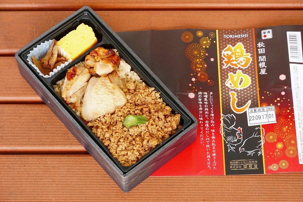 おそらく2022(令和4)年1月の発売で、京王百貨店や阪神百貨店の駅弁大会で輸送販売。今まで「比内地鶏」の名を付けてきた秋田駅の関根屋の鶏飯駅弁で、これを名乗らないシンプルな名前の「鶏めし」が出てきた。長方形の容器に炊込みご飯を詰め、掛紙によるとタレにじっくり漬け込み味を染み込ませ焼き上げた味噌風味の鶏肉と、自慢のだし汁で炊いた鶏そぼろで覆い、アスパラ片で彩り、玉子焼といぶり漬大根を添える。