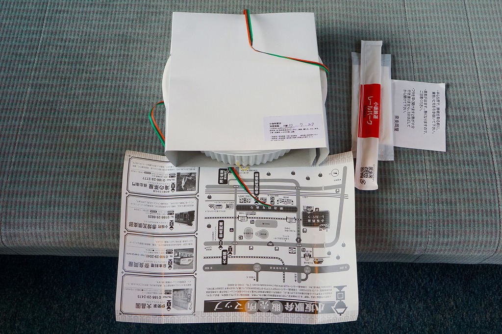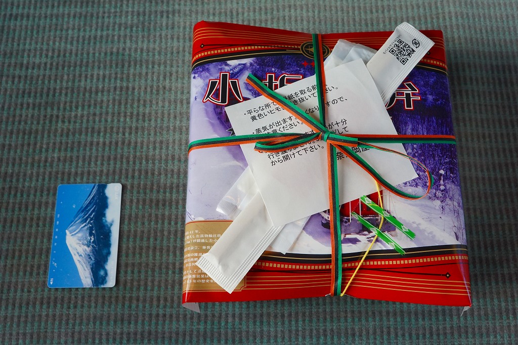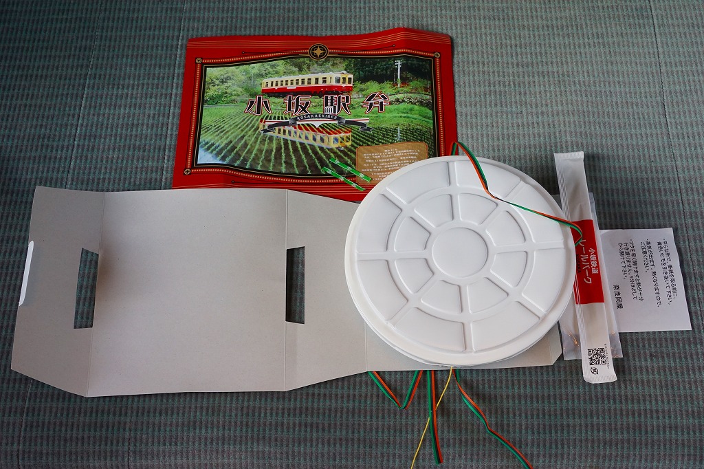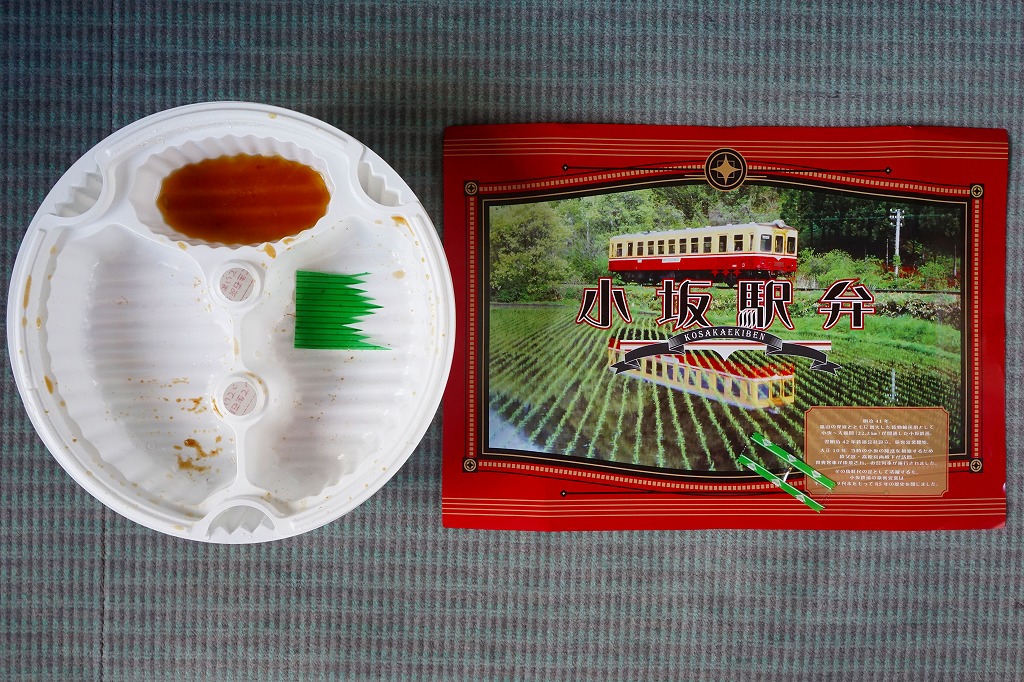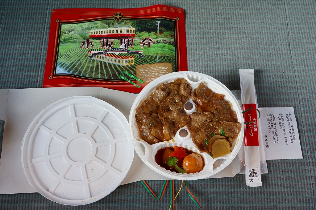 上記の「小坂駅弁」の、大きいほう。駅弁では見たことがないサイズの、大きな円形の加熱機能付き容器を使い、中身は「小」と同じ。掛紙の表面は「小」と違い、小坂鉄道の旅客列車の写真を掲載した。こちらも購入には事前の予約が必要だった。