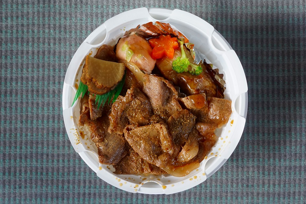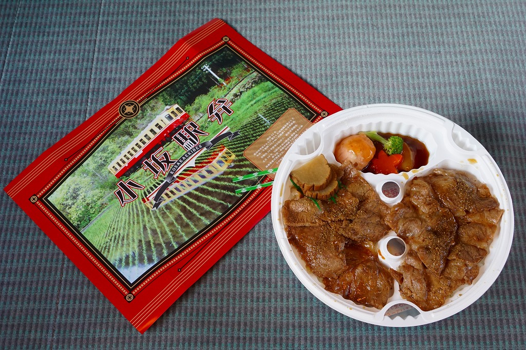 2015(平成27)年1月9日に小坂駅で発売。発売当時は1,000円で、今回の予約購入時には「大」1,200円と「小」800円の2種類があった。こちらは「小」で、仙台駅などの駅弁でおなじみの加熱機能付き容器に、御飯を詰め、豚焼肉で覆い、エビ、枝豆、にんじん、ほうれんそう、いぶり大根を添える。分量は全然「小」でない、肉でなくタレに臭みのある、薄くてざらっとした、たっぷりの豚焼肉丼。