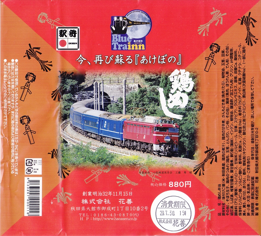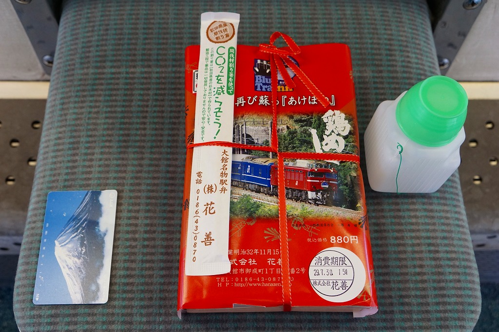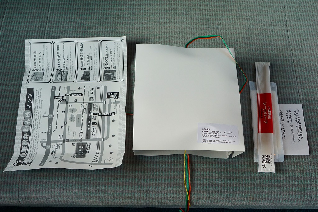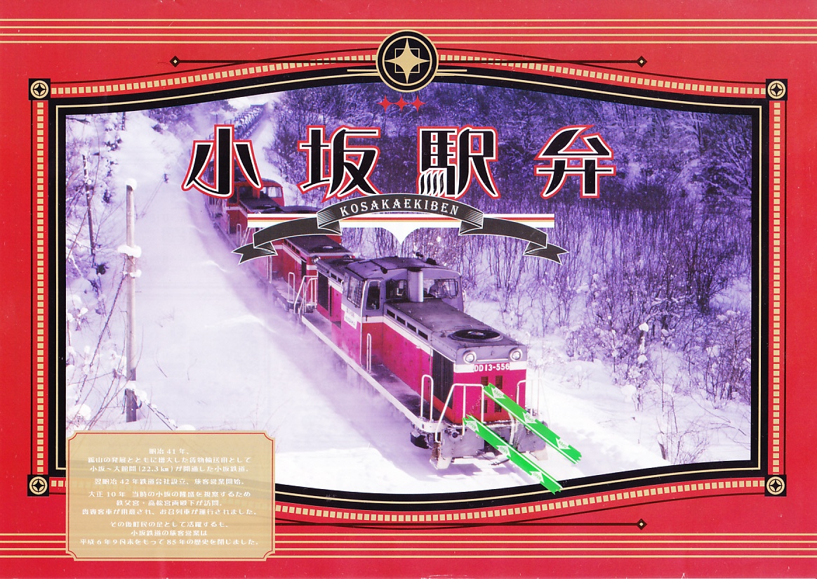 掛紙の表面には小坂鉄道の貨物列車の写真を、裏面には小坂市街の観光地図を載せる。この鉱山町には1909(明治42)年5月に鉄道が通じ、1994(平成6)年9月まで大館駅までの旅客列車が走り、2008(平成20)年3月まで貨物列車が走っていた。その駅の跡地で2014(平成26)年6月に、観光施設「小坂鉄道レールパーク」がオープン、かつての駅舎や線路や車庫や車両を展示し、こんな「駅弁」も売るようになった。