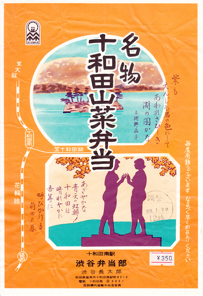 1980年代に使われたのではないかと思われる、昔の十和田南駅弁の掛紙。調製元は渋谷弁当部。十和田湖と乙女の像と、与謝野晶子と前田夕暮の詩を描く。